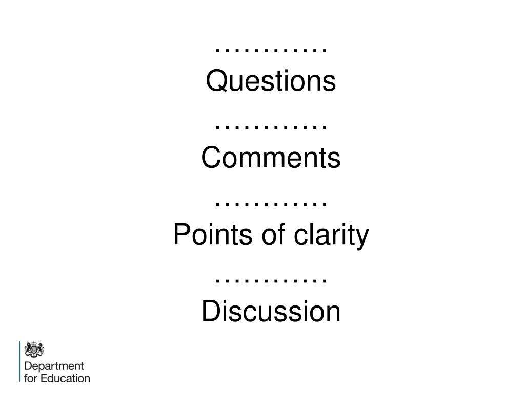 ………… Questions ………… Comments ………… Points of clarity ………… Discussion