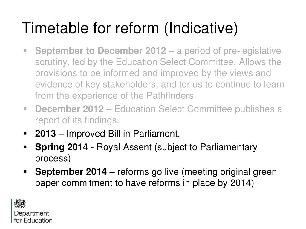 Timetable for reform (Indicative) • September to December 2012 – a period of pre-legislative scrutiny, led by the Education Select Committee. Allows the provisions to be informed and improved by the views and evidence of key stakeholders, and for us to continue to learn from the experience of the Pathfinders. • December 2012 – Education Select Committee publishes a report of its findings. • 2013 – Improved Bill in Parliament. • Spring 2014 - Royal Assent (subject to Parliamentary process) • September 2014 – reforms go live (meeting original green paper commitment to have reforms in place by 2014)