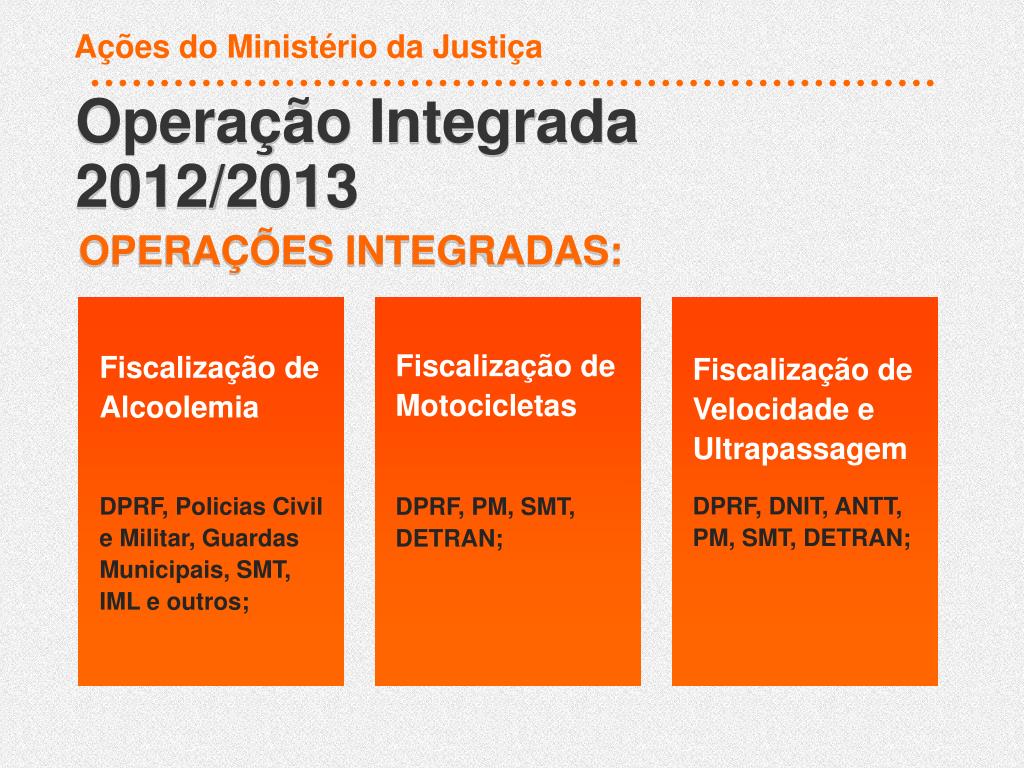 Ações do Ministério da Justiça Operação Integrada 2012/2013 Duração: 15/12/2012 a 13/02/2013 Operações Integradas (PRF, DETRANs, Polícias Militares, Polícias Civis, órgãos municipais e estaduais de trânsito,concessionárias de rodovias) nos trechos mais críticos das rodovias federais.