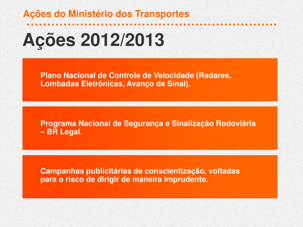 Ações do Ministério dos Transportes Ações 2012/2013 Plano Nacional de Controle de Velocidade (Radares, Lombadas Eletrônicas, Avanço de Sinal). Programa Nacional de Segurança e Sinalização Rodoviária – BR Legal. Campanhas publicitárias de conscientização, voltadas para o risco de dirigir de maneira imprudente.