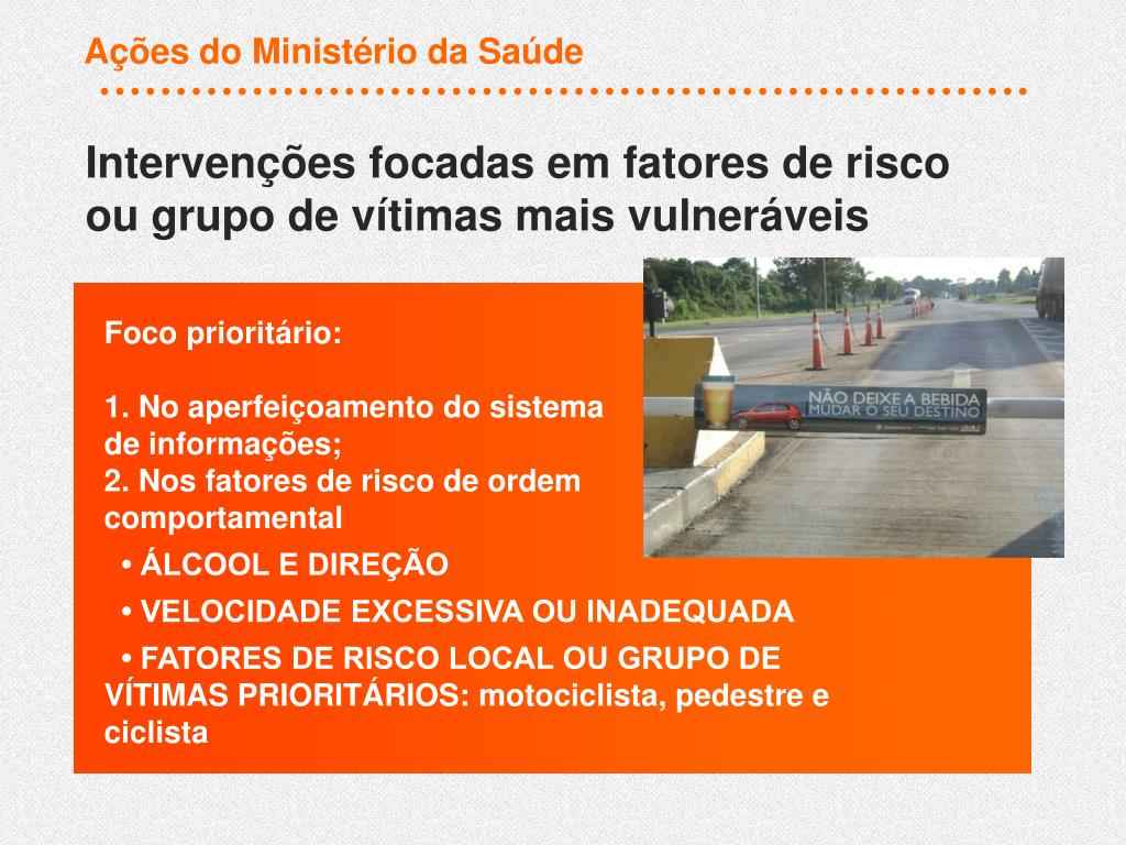 Ações do Ministério da Saúde Intervenções focadas em fatores de risco ou grupo de vítimas mais vulneráveis • Foco prioritário: • 1. No aperfeiçoamento do sistema de informações; • 2. Nos fatores de risco de ordem comportamental • • ÁLCOOL E DIREÇÃO • • VELOCIDADE EXCESSIVA OU INADEQUADA • • FATORES DE RISCO LOCAL OU GRUPO DE VÍTIMAS PRIORITÁRIOS: motociclista, pedestre e ciclista