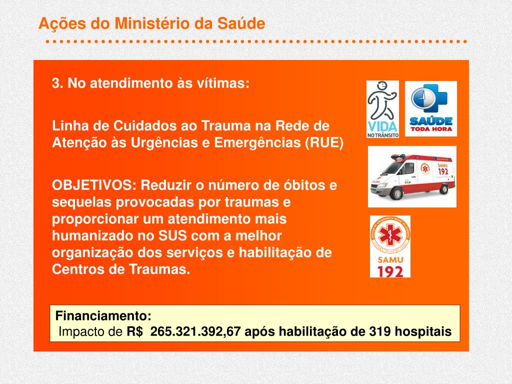 Ações do Ministério da Saúde • 3. No atendimento às vítimas: • Linha de Cuidados ao Trauma na Rede de Atenção às Urgências e Emergências (RUE) • OBJETIVOS: Reduzir o número de óbitos e sequelas provocadas por traumas e proporcionar um atendimento mais humanizado no SUS com a melhor organização dos serviços e habilitação de Centros de Traumas. Financiamento: Impacto de R$ 265.321.392,67 após habilitação de 319 hospitais