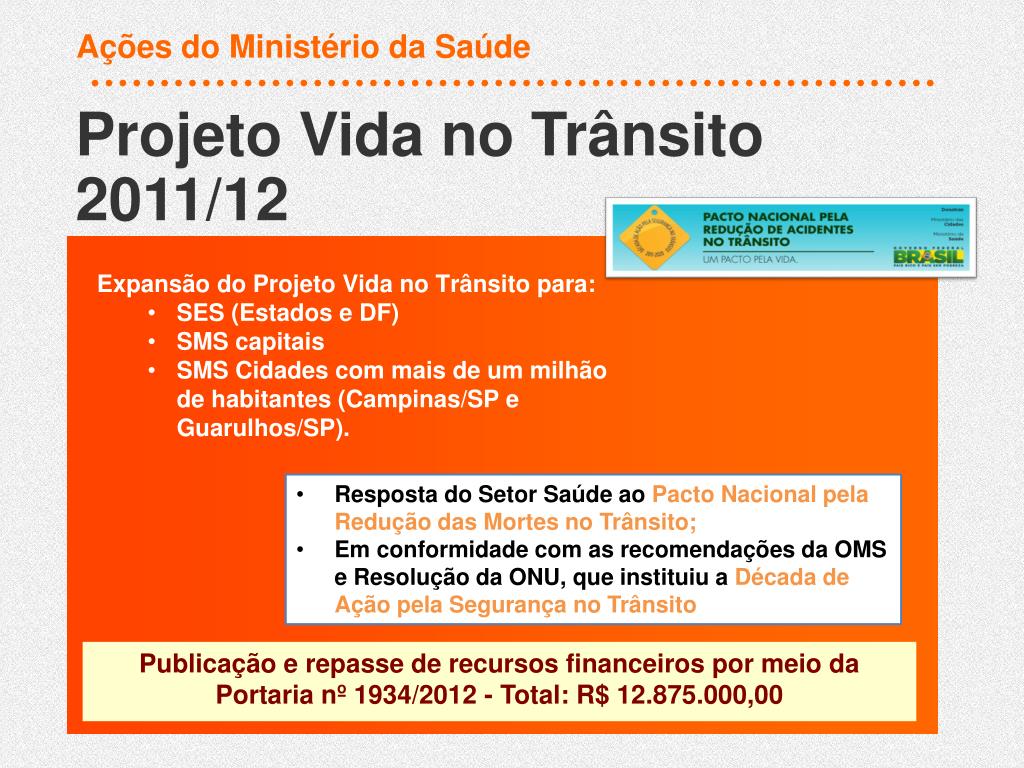Ações do Ministério da Saúde Projeto Vida no Trânsito 2011/12 • Expansão do Projeto Vida no Trânsito para: • SES (Estados e DF) • SMS capitais • SMS Cidades com mais de um milhão de habitantes (Campinas/SP e Guarulhos/SP). • Resposta do Setor Saúde ao Pacto Nacional pela Redução das Mortes no Trânsito; • Em conformidade com as recomendações da OMS e Resolução da ONU, que instituiu a Década de Ação pela Segurança no Trânsito • Publicação e repasse de recursos financeiros por meio da Portaria nº 1934/2012 - Total: R$ 12.875.000,00