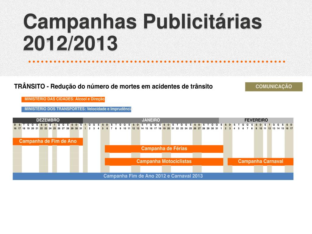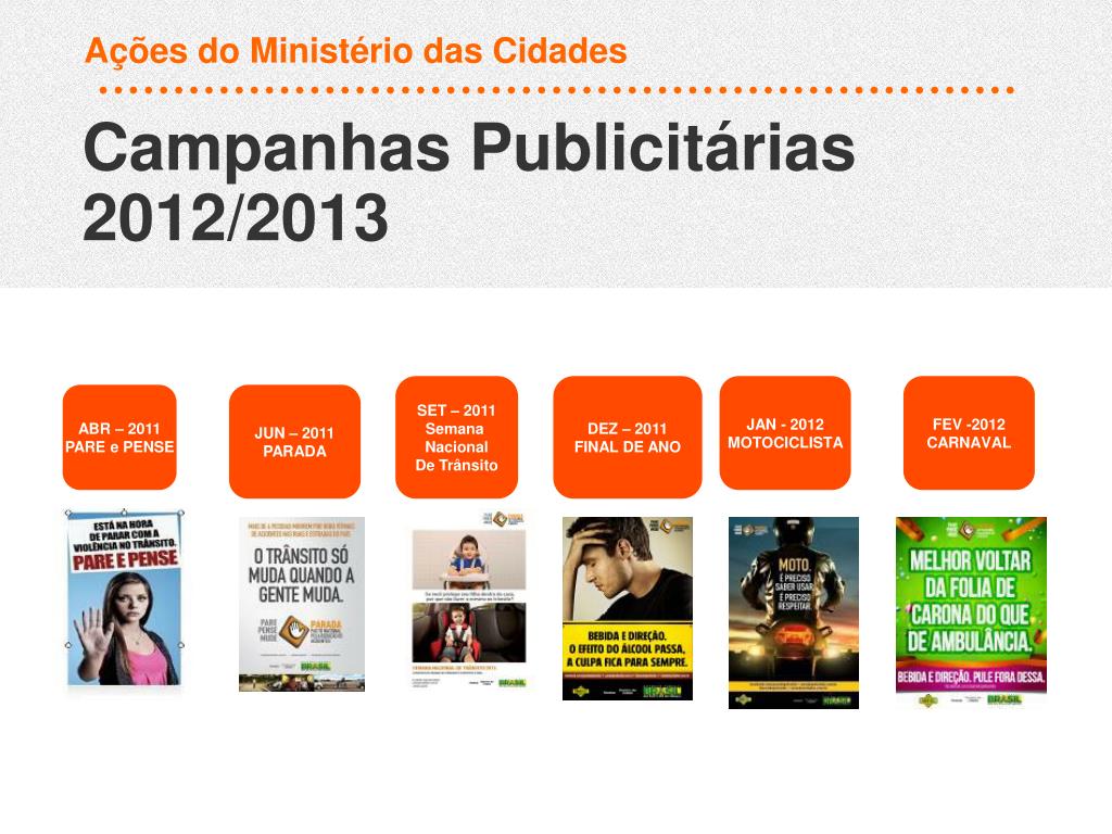 Ações do Ministério das Cidades Campanhas Publicitárias 2012/2013 SET – 2011 Semana Nacional De Trânsito DEZ – 2011 FINAL DE ANO JAN - 2012 MOTOCICLISTA FEV -2012 CARNAVAL ABR – 2011 PARE e PENSE JUN – 2011 PARADA