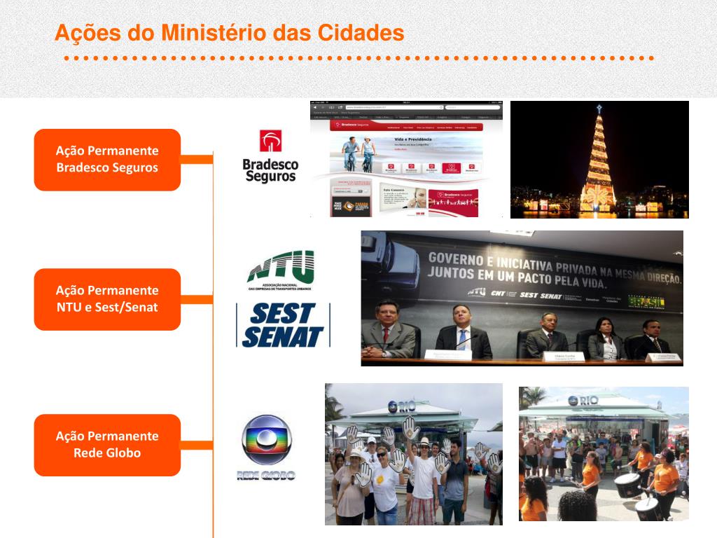Ações do Ministério das Cidades Ação Permanente Bradesco Seguros Ação Permanente NTU e Sest/Senat Ação Permanente Rede Globo