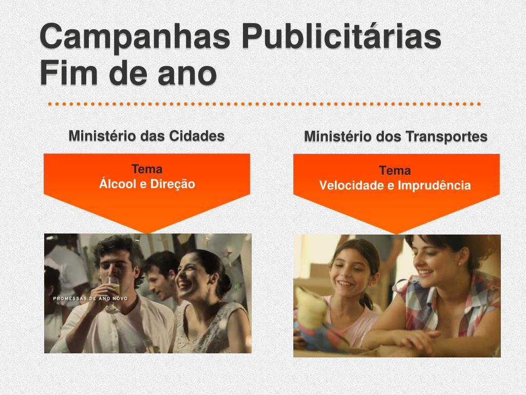 Campanhas Publicitárias Fim de ano Ministério das Cidades Ministério dos Transportes Tema Álcool e Direção Tema Velocidade e Imprudência