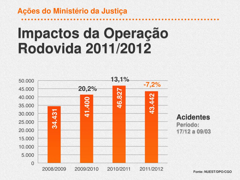 Ações do Ministério da Justiça Impactos da Operação Rodovida 2011/2012 13,1% -7,2% 20,2% Acidentes Período: 17/12 a 09/03 Fonte: NUEST/DPO/CGO