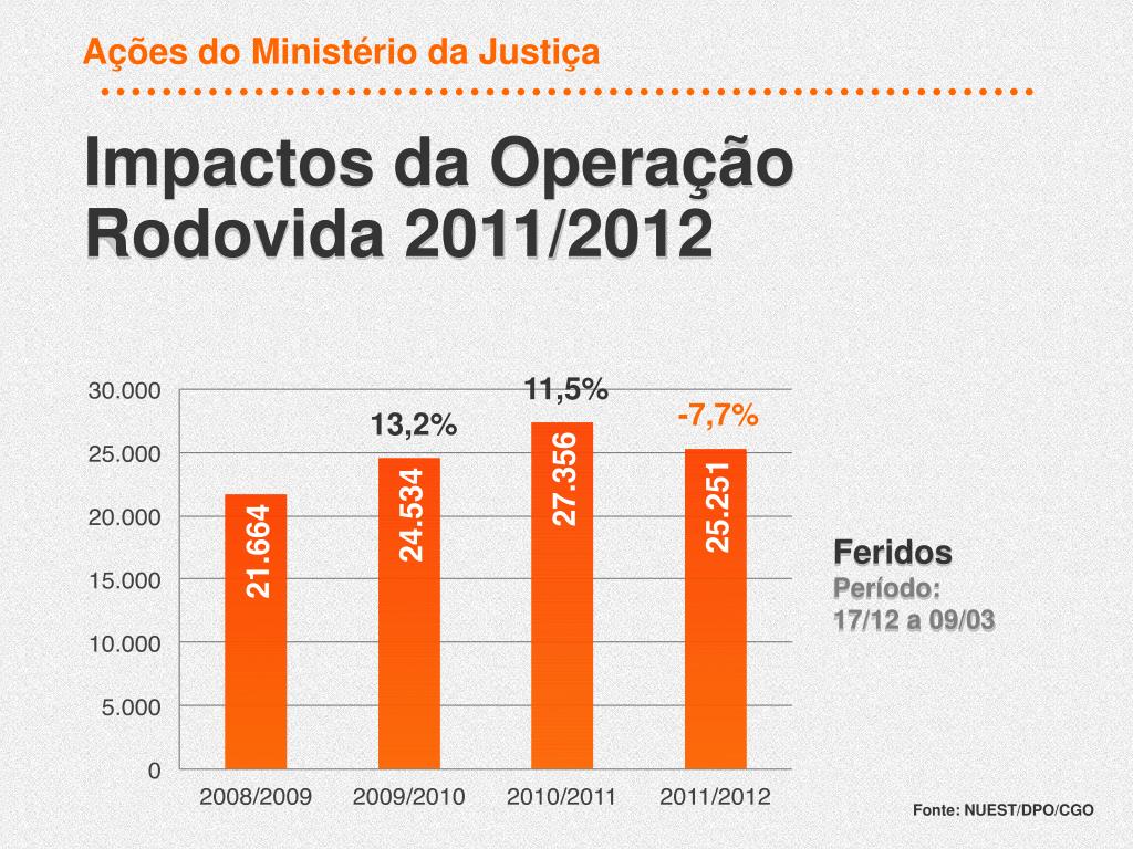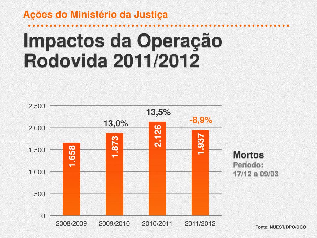 Ações do Ministério da Justiça Impactos da Operação Rodovida 2011/2012 11,5% -7,7% 13,2% Feridos Período: 17/12 a 09/03 Fonte: NUEST/DPO/CGO