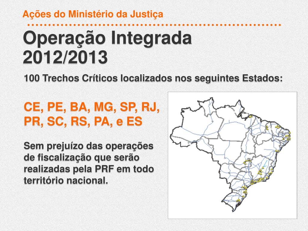 Ações do Ministério da Justiça Operação Integrada 2012/2013 100 Trechos Críticos localizados nos seguintes Estados: CE, PE, BA, MG, SP, RJ, PR, SC, RS, PA, e ES Sem prejuízo das operações de fiscalização que serão realizadas pela PRF em todo território nacional.