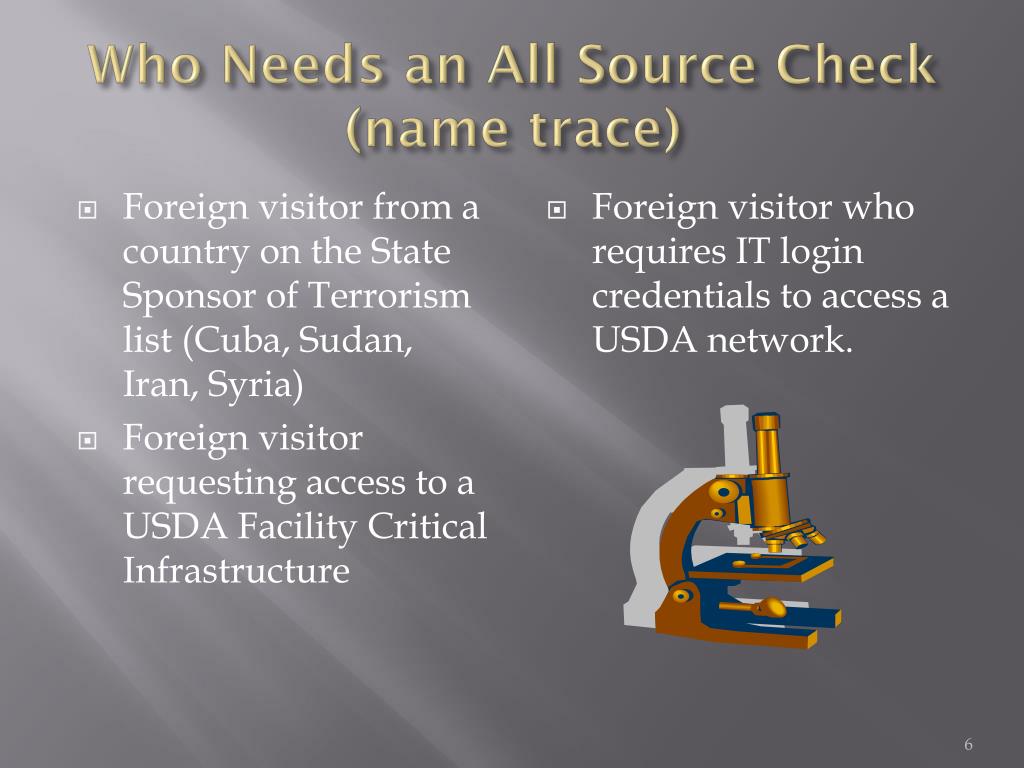 Who Needs an All Source Check (name trace) • Foreign visitor from a country on the State Sponsor of Terrorism list (Cuba, Sudan, Iran, Syria) • Foreign visitor requesting access to a USDA Facility Critical Infrastructure • Foreign visitor who requires IT login credentials to access a USDA network.