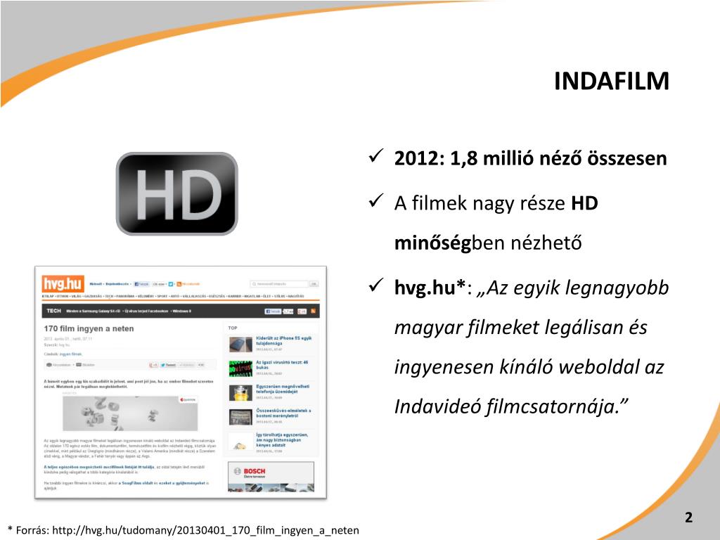 Általános médiaajánlat. Érvényes: 2014. június 19-től. Indafilm. 2012: 1,8 millió néző összesen A filmek nagy része HD minőség ben nézhető hvg.hu * : „ Az egyik legnagyobb magyar filmeket legálisan és ingyenesen kínáló weboldal az Indavideó filmcsatornája .”.
