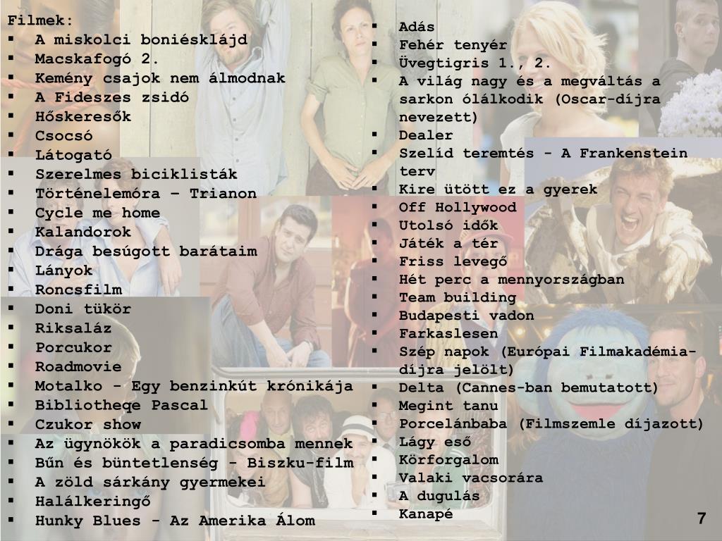 Filmek: • A miskolci boniésklájd • Macskafogó 2. • Kemény csajok nem álmodnak • A Fideszes zsidó • Hőskeresők • Csocsó • Látogató • Szerelmes biciklisták • Történelemóra – Trianon • Cyclemehome • Kalandorok • Drága besúgott barátaim • Lányok • Roncsfilm • Doni tükör • Riksaláz • Porcukor • Roadmovie • Motalko - Egy benzinkút krónikája • BibliotheqePascal • Czukorshow • Az ügynökök a paradicsomba mennek • Bűn és büntetlenség - Biszku-film • A zöld sárkány gyermekei • Halálkeringő • Hunky Blues - Az Amerika Álom • Adás • Fehér tenyér • Üvegtigris 1., 2. • A világ nagy és a megváltás a sarkon ólálkodik (Oscar-díjra nevezett) • Dealer • Szelíd teremtés - A Frankenstein terv • Kire ütött ez a gyerek • Off Hollywood • Utolsó idők • Játék a tér • Friss levegő • Hét perc a mennyországban • Team building • Budapesti vadon • Farkaslesen • Szép napok (Európai Filmakadémia-díjra jelölt) • Delta (Cannes-ban bemutatott) • Megint tanu • Porcelánbaba (Filmszemle díjazott) • Lágy eső • Körforgalom • Valaki vacsorára • A dugulás • Kanapé