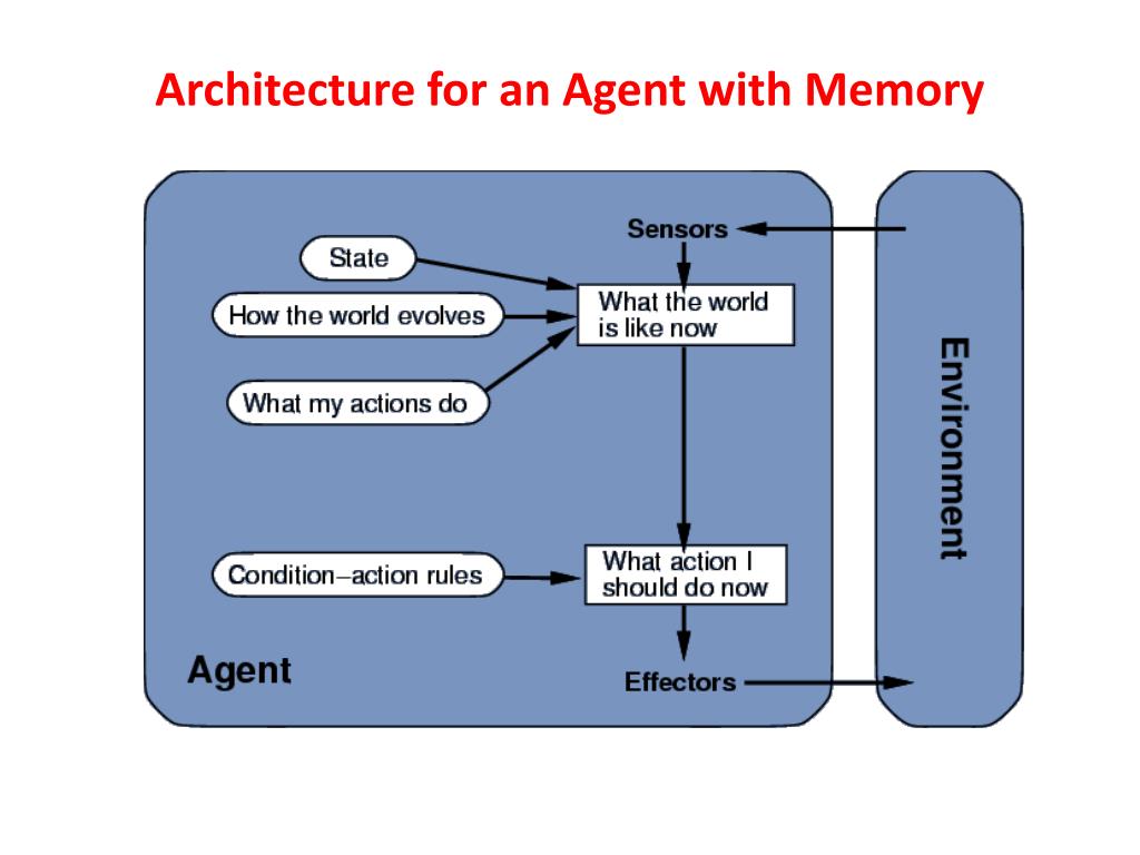 Agents with Memory • Encode “internal state” of the world to remember the past as contained in earlier percepts. • Needed because sensors do not usually give the entire state of the world at each input, so perception of the environment is captured over time. “State” is used to encode different "world states" that generate the same immediate percept. • Requires ability to represent change in the world; one possibility is to represent just the latest state, but then can’t reason about hypothetical courses of action.