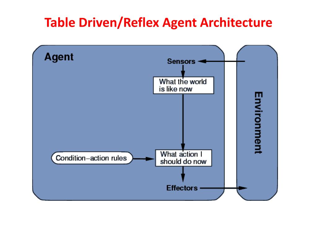 Table Driven Agents • Table lookup of percept-action pairs mapping from every possible perceived state to the optimal action for that state • Problems • Too big to generate and to store (Chess has about 10120 states) • No knowledge of non-perceptual parts of the current state • Not adaptive to changes in the environment; requires entire table to be updated if changes occur • Looping: Can’t make actions conditional on previous actions/states.