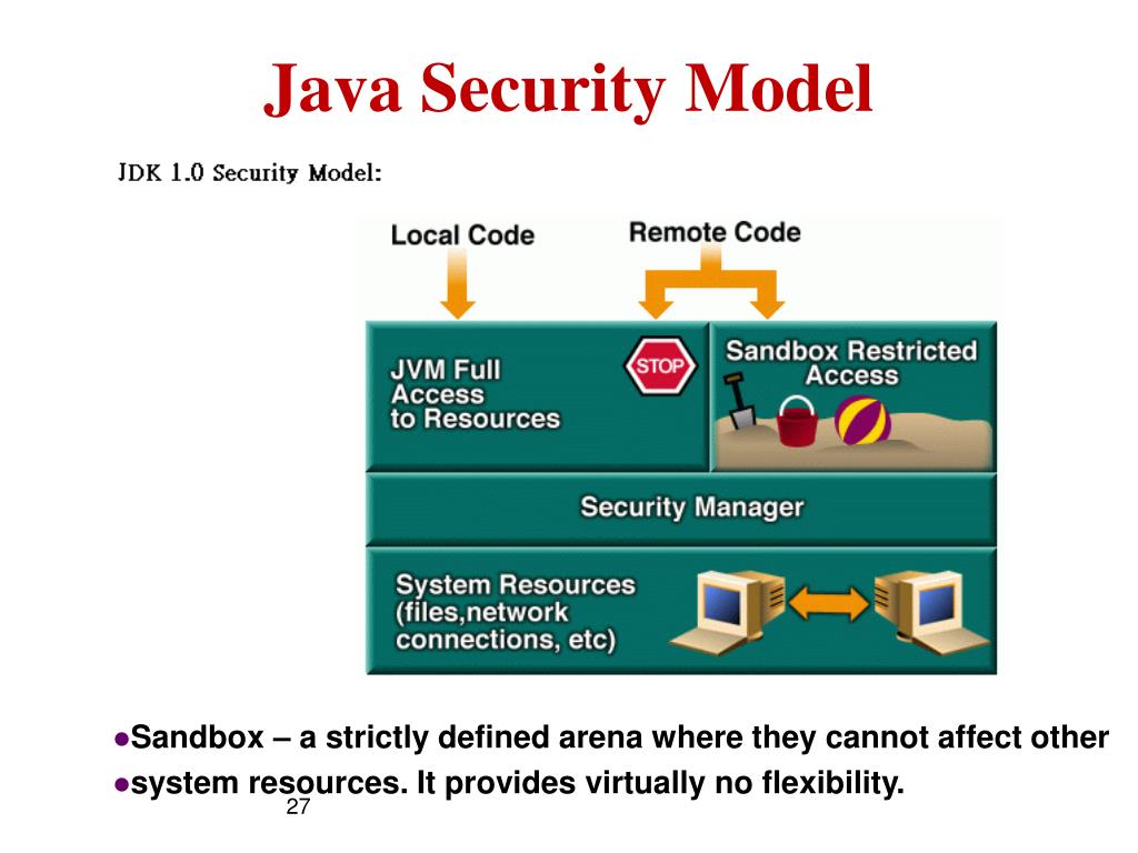 Java Security Model Sandbox – a strictly defined arena where they cannot affect other system resources. It provides virtually no flexibility.
