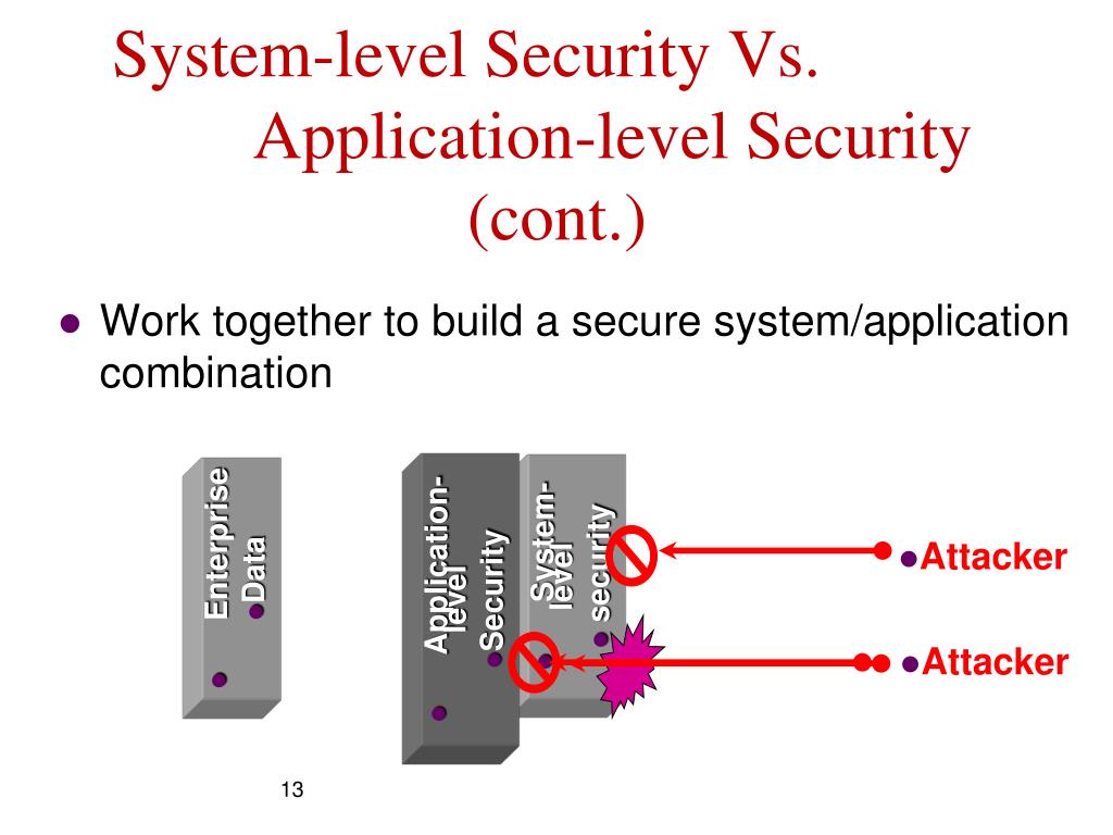 System-level Security Vs. Application-level Security (cont.) • Work together to build a secure system/application combination Application-level Security System-level security Enterprise Data Attacker Attacker