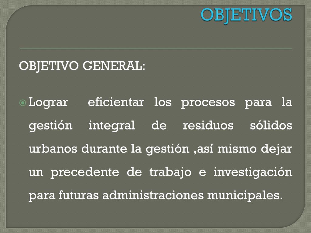 OBJETIVOS OBJETIVO GENERAL: Lograr eficientar los procesos para la gestión integral de residuos sólidos urbanos durante la gestión ,así mismo dejar un precedente de trabajo e investigación para futuras administraciones municipales.
