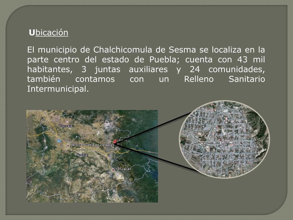 Ubicación El municipio de Chalchicomula de Sesma se localiza en la parte centro del estado de Puebla; cuenta con 43 mil habitantes, 3 juntas auxiliares y 24 comunidades, también contamos con un Relleno Sanitario Intermunicipal.