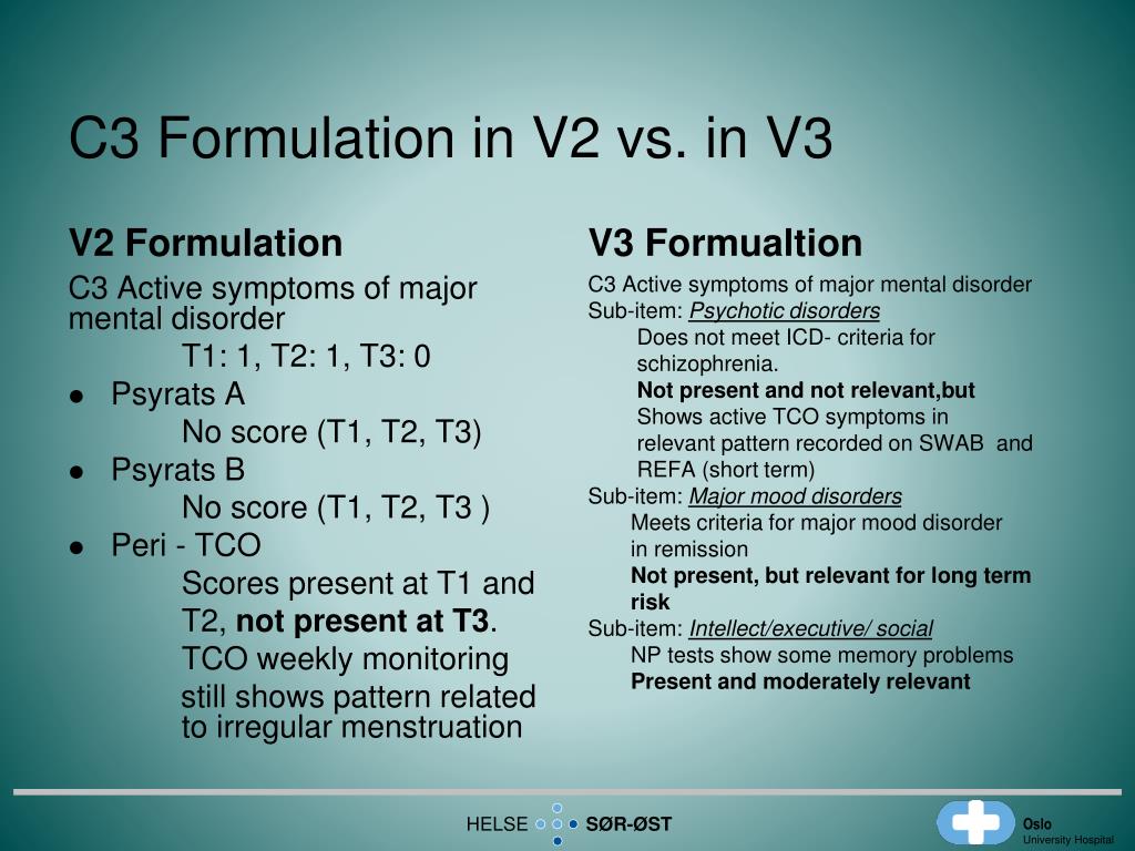 C3 Formulation in V2 vs. in V3 V2 Formulation V3 Formualtion C3 Active symptoms of major mental disorder Sub-item: Psychotic disorders Does not meet ICD- criteria for schizophrenia. Not present and not relevant,but Shows active TCO symptoms in relevant pattern recorded on SWAB and REFA (short term) Sub-item: Major mood disorders Meets criteria for major mood disorder in remission Not present, but relevant for long term risk Sub-item: Intellect/executive/ social NP tests show some memory problems Present and moderately relevant C3 Active symptoms of major mental disorder T1: 1, T2: 1, T3: 0 • Psyrats A No score (T1, T2, T3) • Psyrats B No score (T1, T2, T3 ) • Peri - TCO Scores present at T1 and T2, not present at T3. TCO weekly monitoring still shows pattern related to irregular menstruation