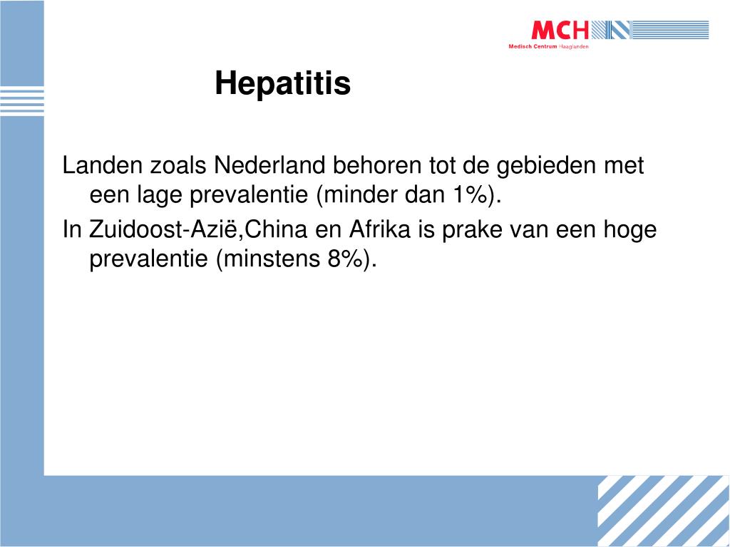 Hepatitis Landen zoals Nederland behoren tot de gebieden met een lage prevalentie (minder dan 1%). In Zuidoost-Azië,China en Afrika is prake van een hoge prevalentie (minstens 8%).