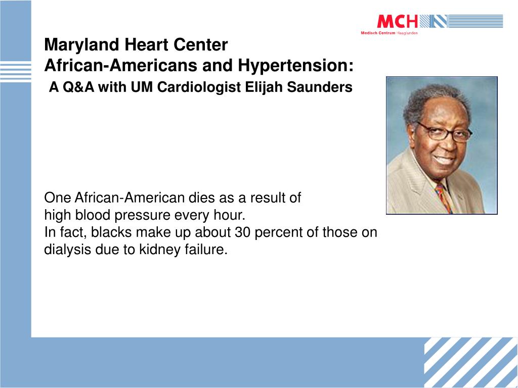 Maryland Heart Center African-Americans and Hypertension: A Q&A with UM Cardiologist Elijah Saunders One African-American dies as a result of high blood pressure every hour. In fact, blacks make up about 30 percent of those on dialysis due to kidney failure.
