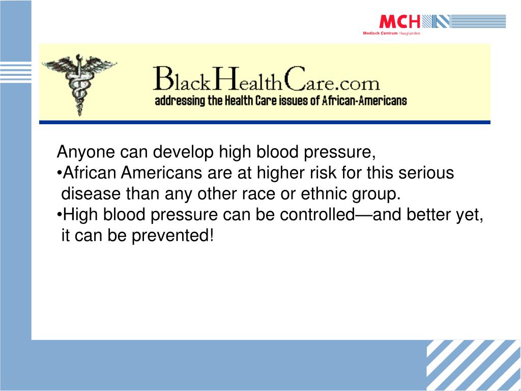 Anyone can develop high blood pressure, • African Americans are at higher risk for this serious • disease than any other race or ethnic group. • High blood pressure can be controlled—and better yet, • it can be prevented!