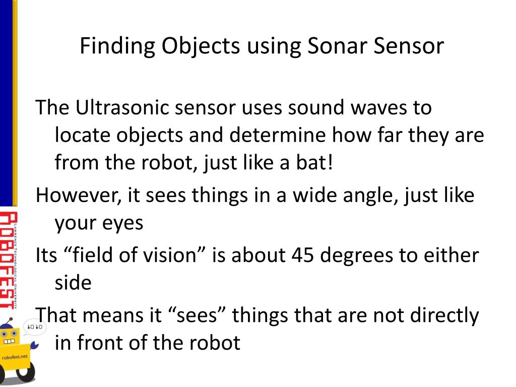 Finding Objects using Sonar Sensor • The Ultrasonic sensor uses sound waves to locate objects and determine how far they are from the robot, just like a bat! • However, it sees things in a wide angle, just like your eyes • Its “field of vision” is about 45 degrees to either side • That means it “sees” things that are not directly in front of the robot