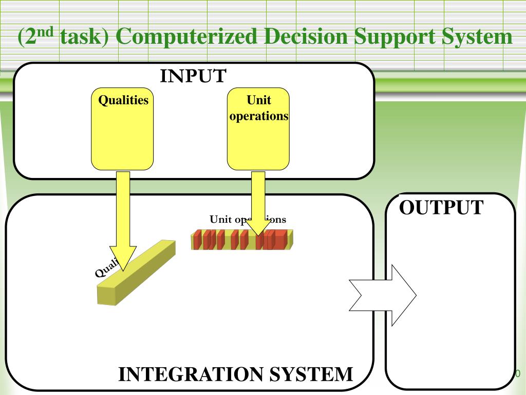 (2nd task) Computerized Decision Support System INPUT Qualities Unit operations OUTPUT Unit operations Qualities INTEGRATION SYSTEM