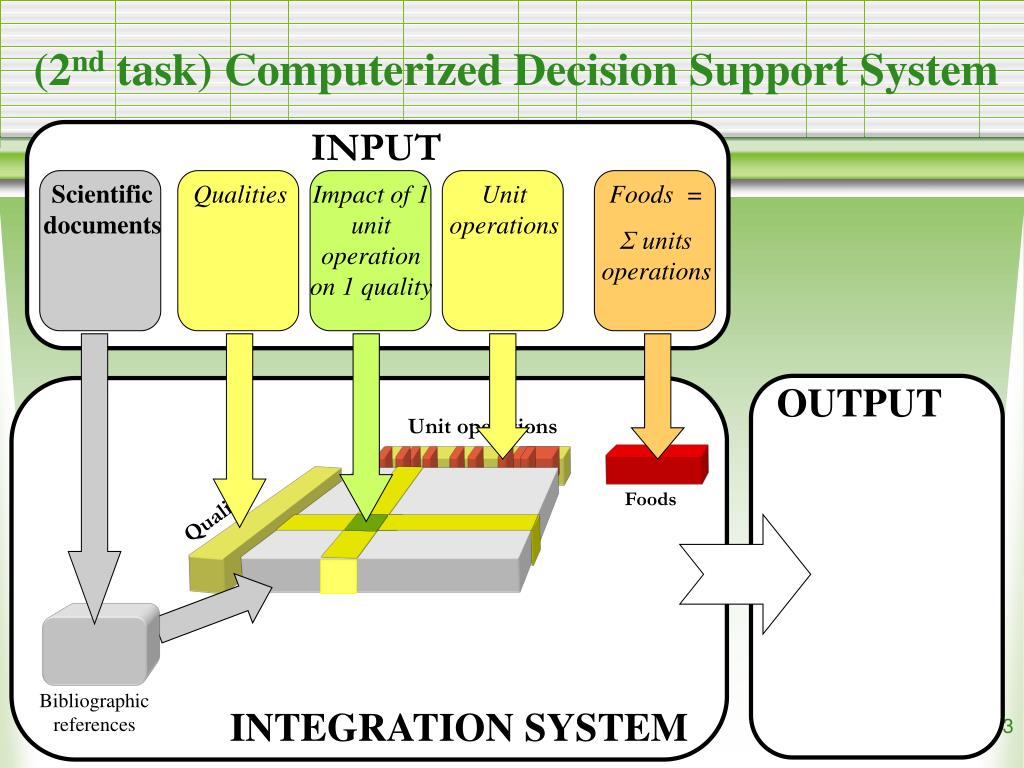 (2nd task) Computerized Decision Support System INPUT Qualities Impact of 1 unit operation on 1 quality Unit operations Foods = Σ units operations OUTPUT Unit operations Foods Qualities INTEGRATION SYSTEM
