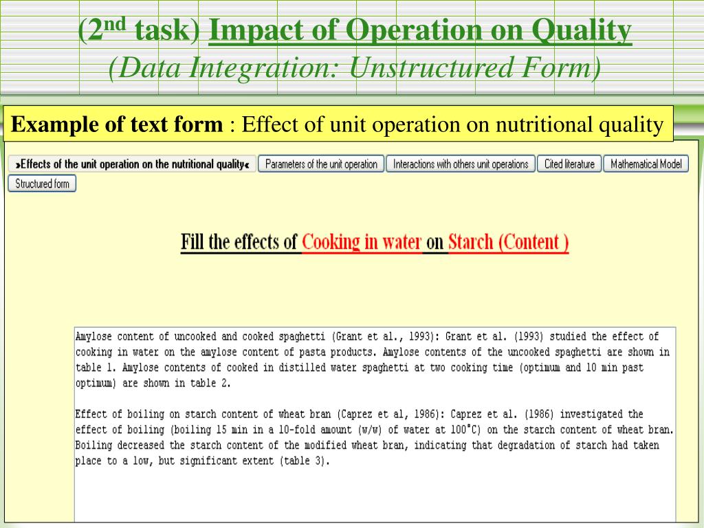 (2nd task) Impact of Operation on Quality(data integration: 6 parts) 1. Effect of unit operation on nutritional quality 2. Impact of unit operation parameters 3. Interactions with other unit operations 4. Cited literature 5. Experimental data 6. Mathematical model Unstructured forms (text files) Structured forms Model forms