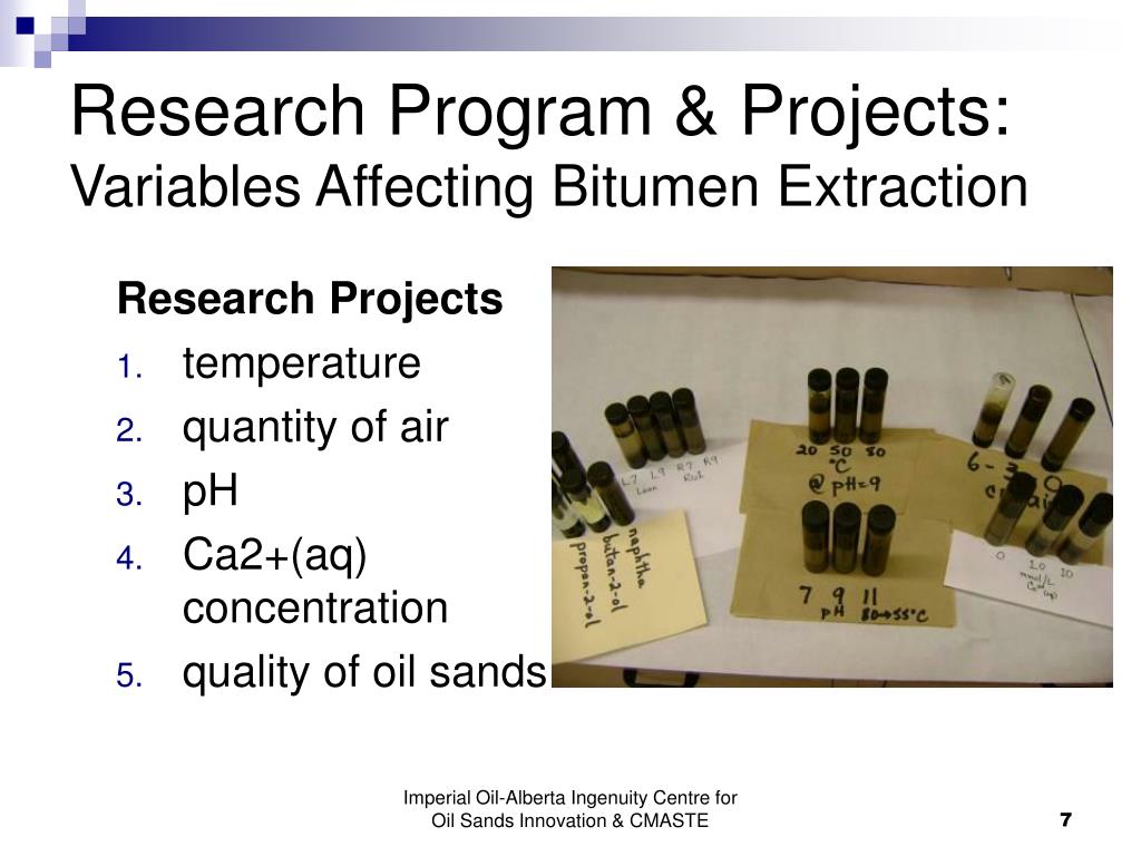 Research Program & Projects: Variables Affecting Bitumen Extraction Research Projects • temperature • quantity of air • pH • Ca2+(aq) concentration • quality of oil sands Imperial Oil-Alberta Ingenuity Centre for Oil Sands Innovation & CMASTE