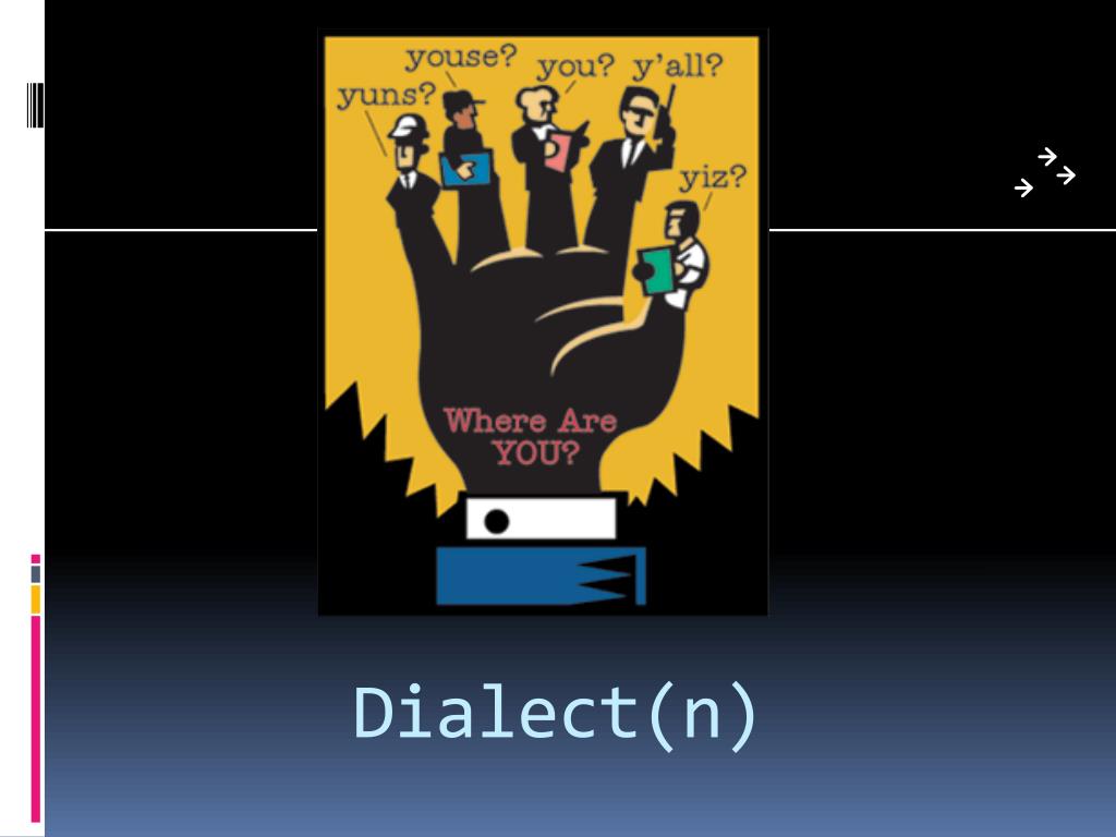 Dialect (noun) • Use of words or phrases that are limited to a certain area • NORTH: “Plug that IN for me, please.” • SOUTH: “Plug that UP for me, please.” • NORTH: “HIT the lights!” • SOUTH: “CUT OFF the lights!”