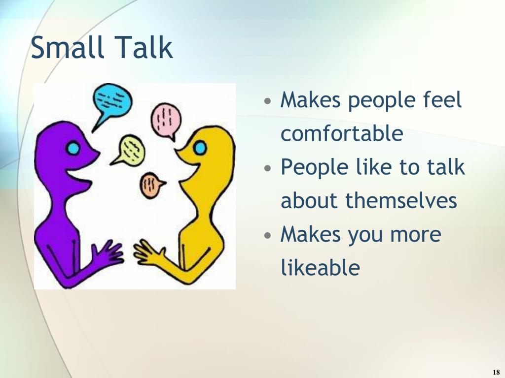 Small Talk Makes people feel comfortable People like to talk about themselves Makes you more likeable