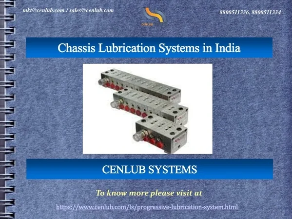mkt@cenlub.com / sales@cenlub.com 8800511336, 8800511334 Uses of Chassis Lubrication Systems • A progressive lubrication system is widely used for the machines of: • Steel plants • Paper plants • Heavy-duty power presses • Printing machines • Textile machines • Packaging machines • Metal working • Material handling equipment • Injection molding machines • Mobile equipment • Chassis lubrication, etc.