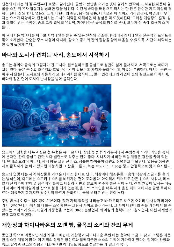 마지막한잔의균형 밤바다에서의마지막잔은다음날의컨디션과직결된다. 높은도수의스트레이트를마지막에두는습관은낭만 적이지만, 시간이길어진밤에는탈이잦다. 마지막잔은도수를낮추고당도와산도를조금올려수분을보태는 방식이안전하다. 스프리츠, 하이볼, 로우 ABV 셰리칵테일이여기맞춤이다. 계산을마친뒤에도물한잔을천 천히비우고일어서면귀가의진동이훨씬부드럽다. 인천밤바다의잔이특별한이유 인천은경계의도시다. 바다와육지, 국내와해외, 옛상권과신도시, 여러층위가동시에보인다. 이겹침이잔의 해석을풍부하게만든다. 어떤밤에는라임한방울이도시의각을깎는듯보이고, 다른밤에는얼음의투명도가 바다의어둠을밝히는듯느껴진다. 같은레시피라도, 같은자리라도, 날씨와조명, 바텐더의손과손님의마음이 바뀌면전혀다른잔이된다. 그래서이도시의바는자주와도지루하지않다. 바다와함께있는시간은늘새로 워서, 배울것이남는다. 이글의목적은특정한가게의이름을나열하는것이아니라, 인천의밤바다를배경으로한술의본질을조금더 정확히붙잡는데있다. 어디를가든, 어떤잔을마시든, 바다의호흡과잔의리듬이만나면밤은단단해진다. 유 리와바람, 빛과소금, 허브와과일, 그리고사람. 이들의균형을고르게맞춰나가는한밤의연습, 그자체가이 도시가주는좋은공부다.