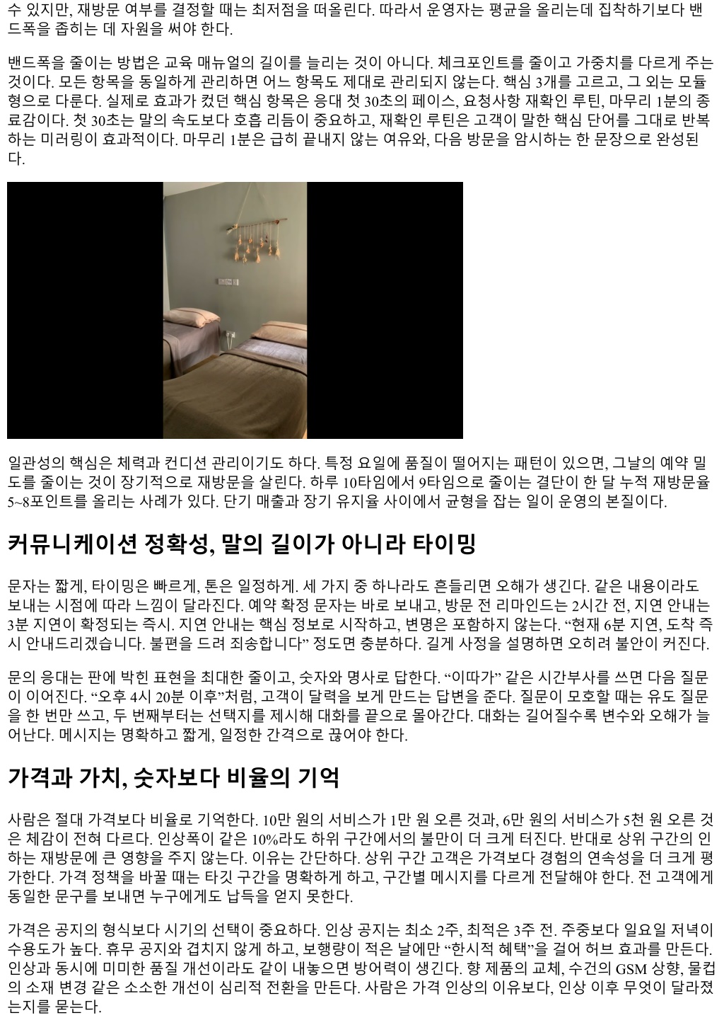 수있지만, 재방문여부를결정할때는최저점을떠올린다. 따라서운영자는평균을올리는데집착하기보다밴 드폭을좁히는데자원을써야한다. 밴드폭을줄이는방법은교육매뉴얼의길이를늘리는것이아니다. 체크포인트를줄이고가중치를다르게주는 것이다. 모든항목을동일하게관리하면어느항목도제대로관리되지않는다. 핵심 3개를고르고, 그외는모듈 형으로다룬다. 실제로효과가컸던핵심항목은응대첫 30초의페이스, 요청사항재확인루틴, 마무리 1분의종 료감이다. 첫 30초는말의속도보다호흡리듬이중요하고, 재확인루틴은고객이말한핵심단어를그대로반복 하는미러링이효과적이다. 마무리 1분은급히끝내지않는여유와, 다음방문을암시하는한문장으로완성된 다. 일관성의핵심은체력과컨디션관리이기도하다. 특정요일에품질이떨어지는패턴이있으면, 그날의예약밀 도를줄이는것이장기적으로재방문을살린다. 하루 10타임에서 9타임으로줄이는결단이한달누적재방문율 5~8포인트를올리는사례가있다. 단기매출과장기유지율사이에서균형을잡는일이운영의본질이다. 커뮤니케이션정확성, 말의길이가아니라타이밍 문자는짧게, 타이밍은빠르게, 톤은일정하게. 세가지중하나라도흔들리면오해가생긴다. 같은내용이라도 보내는시점에따라느낌이달라진다. 예약확정문자는바로보내고, 방문전리마인드는 2시간전, 지연안내는 3분지연이확정되는즉시. 지연안내는핵심정보로시작하고, 변명은포함하지않는다. “현재 6분지연, 도착즉 시안내드리겠습니다. 불편을드려죄송합니다” 정도면충분하다. 길게사정을설명하면오히려불안이커진다. 문의응대는판에박힌표현을최대한줄이고, 숫자와명사로답한다. “이따가” 같은시간부사를쓰면다음질문 이이어진다. “오후 4시 20분이후”처럼, 고객이달력을보게만드는답변을준다. 질문이모호할때는유도질문 을한번만쓰고, 두번째부터는선택지를제시해대화를끝으로몰아간다. 대화는길어질수록변수와오해가늘 어난다. 메시지는명확하고짧게, 일정한간격으로끊어야한다. 가격과가치, 숫자보다비율의기억 사람은절대가격보다비율로기억한다. 10만원의서비스가 1만원오른것과, 6만원의서비스가 5천원오른것 은체감이전혀다르다. 인상폭이같은 10%라도하위구간에서의불만이더크게터진다. 반대로상위구간의인 하는재방문에큰영향을주지않는다. 이유는간단하다. 상위구간고객은가격보다경험의연속성을더크게평 가한다. 가격정책을바꿀때는타깃구간을명확하게하고, 구간별메시지를다르게전달해야한다. 전고객에게 동일한문구를보내면누구에게도납득을얻지못한다. 가격은공지의형식보다시기의선택이중요하다. 인상공지는최소 2주, 최적은 3주전. 주중보다일요일저녁이 수용도가높다. 휴무공지와겹치지않게하고, 보행량이적은날에만 “한시적혜택”을걸어허브효과를만든다. 인상과동시에미미한품질개선이라도같이내놓으면방어력이생긴다. 향제품의교체, 수건의 GSM 상향, 물컵 의소재변경같은소소한개선이심리적전환을만든다. 사람은가격인상의이유보다, 인상이후무엇이달라졌 는지를묻는다.