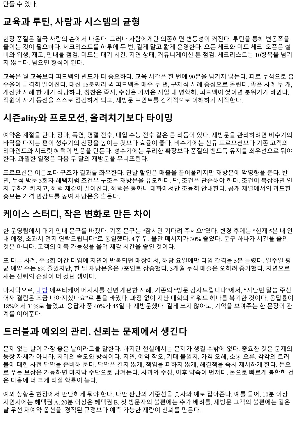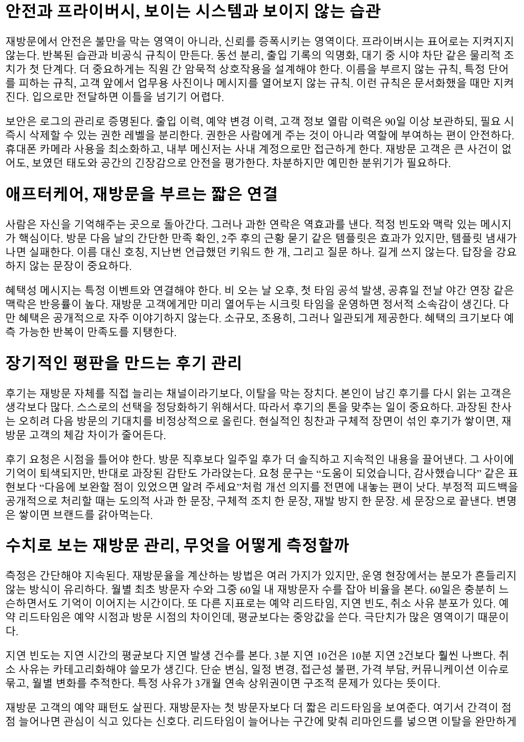 만들수있다. 교육과루틴, 사람과시스템의균형 현장품질은결국사람의손에서나온다. 그러나사람에게만의존하면변동성이커진다. 루틴을통해변동폭을 줄이는것이필요하다. 체크리스트를하루에두번, 길게말고짧게운영한다. 오픈체크와미드체크. 오픈은설 비와위생, 재고, 안내물점검, 미드는대기시간, 지연상태, 커뮤니케이션톤점검. 체크리스트는 10항목을넘기 지않는다. 넘으면형식이된다. 교육은월교육보다피드백의빈도가더중요하다. 교육시간은한번에 90분을넘기지않는다. 피로누적으로흡 수율이급격히떨어진다. 대신 15분짜리퀵피드백을매주두번, 구체적사례중심으로돌린다. 좋은사례두개, 개선할사례한개가적당하다. 칭찬은즉시, 수정은가까운시일내명확히. 피드백이쌓이면분위기가바뀐다. 직원이자기동선을스스로점검하게되고, 재방문포인트를감각적으로이해하기시작한다. 시즌ality와프로모션, 올려치기보다타이밍 예약은계절을탄다. 장마, 폭염, 명절전후, 대입수능전후같은큰리듬이있다. 재방문을관리하려면비수기의 바닥을다지는편이성수기의천장을높이는것보다효율이좋다. 비수기에는신규프로모션보다기존고객의 리마인드와시크릿혜택이반응을만든다. 성수기에는무리한확장보다품질의밴드폭유지를최우선으로둬야 한다. 과밀한일정은다음두달의재방문을무너뜨린다. 프로모션은이름보다구조가결과를좌우한다. 단발할인은매출을끌어올리지만재방문에악영향을준다. 반 면, 누적방문 3회차혜택처럼조건부구조는재방문을유도한다. 단, 조건은단순해야한다. 조건이복잡하면인 지부하가커지고, 혜택체감이떨어진다. 혜택은통화나대화에서만조용히안내한다. 공개채널에서의과도한 홍보는가격민감도를높여재방문을흔든다. 케이스스터디, 작은변화로만든차이 한운영팀에서대기안내문구를바꿨다. 기존문구는 “잠시만기다려주세요”였다. 변경후에는 “현재 5분내안 내예정, 초과시먼저연락드립니다”로통일했다. 4주뒤, 불만메시지가 30% 줄었다. 문구하나가시간을줄인 것은아니다. 고객의예측가능성을올려체감시간을줄인것이다. 또다른사례. 주 3회야간타임에지연이반복되던매장에서, 해당요일에만타임간격을 5분늘렸다. 일주일평 균예약수는 6% 줄었지만, 한달재방문율은 7포인트상승했다. 3개월누적매출은오히려증가했다. 지연으로 새는신뢰의손실이더컸던셈이다. 마지막으로, 대밤애프터케어메시지를전면개편한사례. 기존의 “방문감사드립니다”에서, “지난번말씀주신 어깨결림은조금나아지셨나요”로톤을바꿨다. 과장없이지난대화의키워드하나를복기한것이다. 응답률이 18%에서 31%로늘었고, 응답자중 40%가 45일내재방문했다. 길게쓰지않아도, 기억을보여주는한문장이관 계를이어준다. 트러블과예외의관리, 신뢰는문제에서생긴다 문제없는날이가장좋은날이라고들말한다. 하지만현실에서는문제가생길수밖에없다. 중요한것은문제의 등장자체가아니라, 처리의속도와방식이다. 지연, 예약착오, 기대불일치, 가격오해, 소통오류. 각각의트러 블에대한사전답안을준비해둔다. 답안은길지않게, 책임을피하지않게, 해결책을즉시제시하게한다. 돈으 로푸는보상은가능하면마지막수단으로남겨둔다. 사과와수정, 이후약속이먼저다. 돈으로빠르게봉합한건 은다음에더크게터질확률이높다. 예외상황은현장에서판단하게둬야한다. 다만판단의기준선을숫자와예로잡아준다. 예를들어, 10분이상 지연시에는혜택권 A, 20분이상은혜택권 B. 첫방문자의불편에는추가배려를, 재방문고객의불편에는같은 날우선재예약옵션을. 경직된규정보다예측가능한재량이신뢰를만든다.
