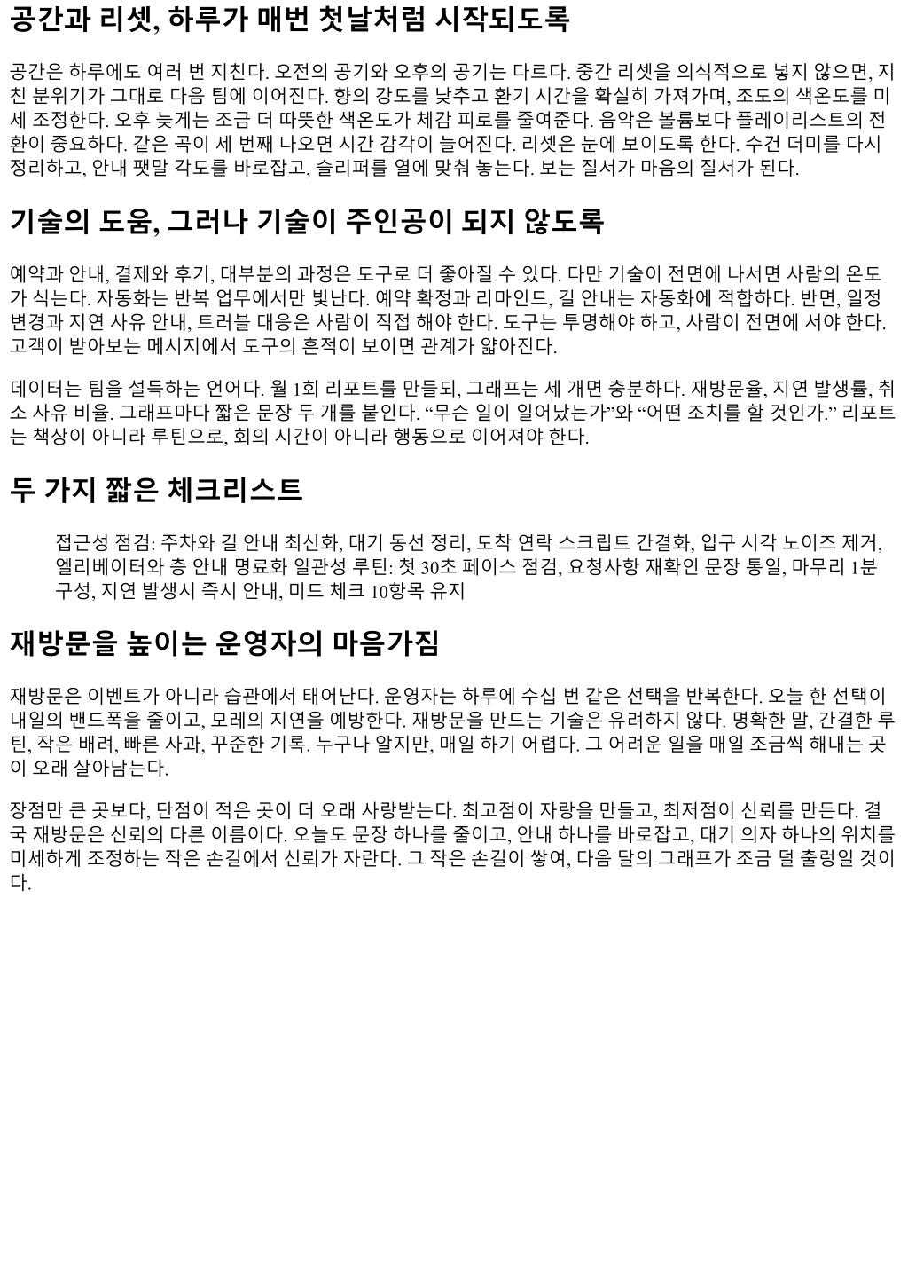 공간과리셋, 하루가매번첫날처럼시작되도록 공간은하루에도여러번지친다. 오전의공기와오후의공기는다르다. 중간리셋을의식적으로넣지않으면, 지 친분위기가그대로다음팀에이어진다. 향의강도를낮추고환기시간을확실히가져가며, 조도의색온도를미 세조정한다. 오후늦게는조금더따뜻한색온도가체감피로를줄여준다. 음악은볼륨보다플레이리스트의전 환이중요하다. 같은곡이세번째나오면시간감각이늘어진다. 리셋은눈에보이도록한다. 수건더미를다시 정리하고, 안내팻말각도를바로잡고, 슬리퍼를열에맞춰놓는다. 보는질서가마음의질서가된다. 기술의도움, 그러나기술이주인공이되지않도록 예약과안내, 결제와후기, 대부분의과정은도구로더좋아질수있다. 다만기술이전면에나서면사람의온도 가식는다. 자동화는반복업무에서만빛난다. 예약확정과리마인드, 길안내는자동화에적합하다. 반면, 일정 변경과지연사유안내, 트러블대응은사람이직접해야한다. 도구는투명해야하고, 사람이전면에서야한다. 고객이받아보는메시지에서도구의흔적이보이면관계가얇아진다. 데이터는팀을설득하는언어다. 월 1회리포트를만들되, 그래프는세개면충분하다. 재방문율, 지연발생률, 취 소사유비율. 그래프마다짧은문장두개를붙인다. “무슨일이일어났는가”와 “어떤조치를할것인가.” 리포트 는책상이아니라루틴으로, 회의시간이아니라행동으로이어져야한다. 두가지짧은체크리스트 접근성점검: 주차와길안내최신화, 대기동선정리, 도착연락스크립트간결화, 입구시각노이즈제거, 엘리베이터와층안내명료화일관성루틴: 첫 30초페이스점검, 요청사항재확인문장통일, 마무리 1분 구성, 지연발생시즉시안내, 미드체크 10항목유지 재방문을높이는운영자의마음가짐 재방문은이벤트가아니라습관에서태어난다. 운영자는하루에수십번같은선택을반복한다. 오늘한선택이 내일의밴드폭을줄이고, 모레의지연을예방한다. 재방문을만드는기술은유려하지않다. 명확한말, 간결한루 틴, 작은배려, 빠른사과, 꾸준한기록. 누구나알지만, 매일하기어렵다. 그어려운일을매일조금씩해내는곳 이오래살아남는다. 장점만큰곳보다, 단점이적은곳이더오래사랑받는다. 최고점이자랑을만들고, 최저점이신뢰를만든다. 결 국재방문은신뢰의다른이름이다. 오늘도문장하나를줄이고, 안내하나를바로잡고, 대기의자하나의위치를 미세하게조정하는작은손길에서신뢰가자란다. 그작은손길이쌓여, 다음달의그래프가조금덜출렁일것이 다.