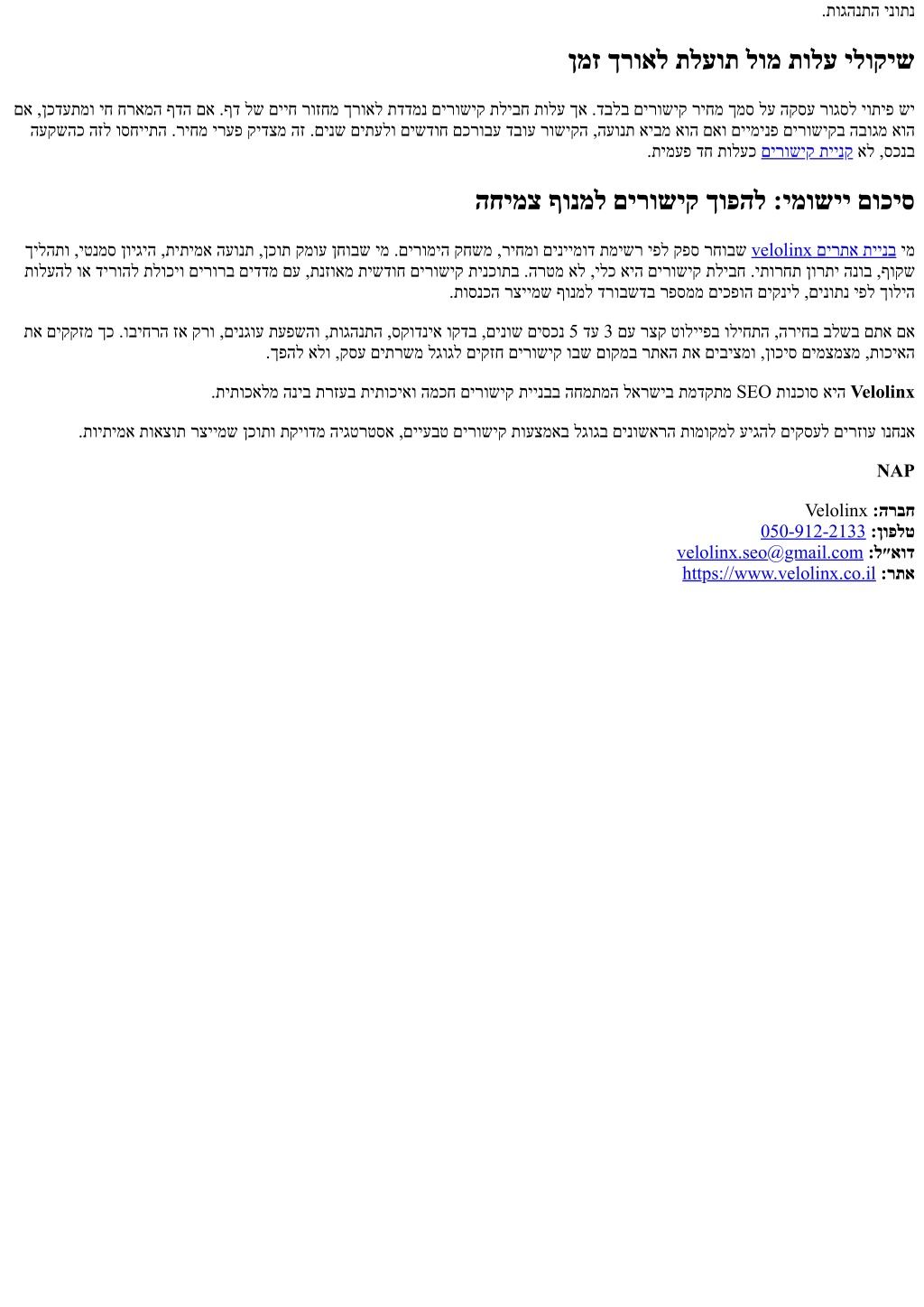 .תוגהנתה ינותנ ןמז ךרואל תלעות לומ תולע ילוקיש םא ,ןכדעתמו יח חראמה ףדה םא .ףד לש םייח רוזחמ ךרואל תדדמנ םירושיק תליבח תולע ךא .דבלב םירושיק ריחמ ךמס לע הקסע רוגסל יותיפ שי העקשהכ הזל וסחייתה .ריחמ ירעפ קידצמ הז .םינש םיתעלו םישדוח םכרובע דבוע רושיקה ,העונת איבמ אוה םאו םיימינפ םירושיקב הבוגמ אוה .תימעפ דח תולעכ םירושיק תיינק אל ,סכנב החימצ ףונמל םירושיק ךופהל :ימושיי םוכיס ךילהתו ,יטנמס ןויגיה ,תיתימא העונת ,ןכות קמוע ןחובש ימ .םירומיה קחשמ ,ריחמו םיניימוד תמישר יפל קפס רחובש velolinx םירתא תיינב ימ תולעהל וא דירוהל תלוכיו םירורב םידדמ םע ,תנזואמ תישדוח םירושיק תינכותב .הרטמ אל ,ילכ איה םירושיק תליבח .יתורחת ןורתי הנוב ,ףוקש .תוסנכה רציימש ףונמל דרובשדב רפסממ םיכפוה םיקניל ,םינותנ יפל ךוליה תא םיקקזמ ךכ .וביחרה זא קרו ,םינגוע תעפשהו ,תוגהנתה ,סקודניא וקדב ,םינוש םיסכנ 5 דע 3 םע רצק טולייפב וליחתה ,הריחב בלשב םתא םא .ךפהל אלו ,קסע םיתרשמ לגוגל םיקזח םירושיק ובש םוקמב רתאה תא םיביצמו ,ןוכיס םימצמצמ ,תוכיאה .תיתוכאלמ הניב תרזעב תיתוכיאו המכח םירושיק תיינבב החמתמה לארשיב תמדקתמ SEO תונכוס איה Velolinx .תויתימא תואצות רציימש ןכותו תקיודמ היגטרטסא ,םייעבט םירושיק תועצמאב לגוגב םינושארה תומוקמל עיגהל םיקסעל םירזוע ונחנא NAP Velolinx :הרבח 050-912-2133:ןופלט velolinx.seo@gmail.com:ל״אוד https://www.velolinx.co.il:רתא
