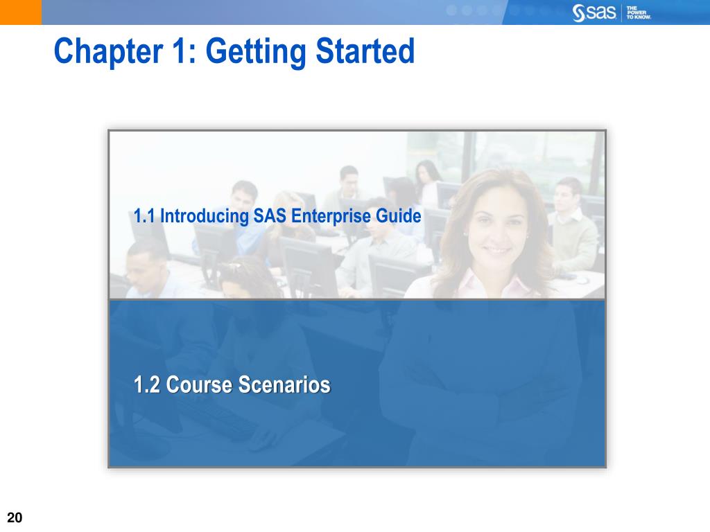 Chapter 1: Getting Started. Chapter 1: Getting Started. Objectives. State the capabilities and major features of SAS Enterprise Guide software. State the purpose of the different areas of the SAS Enterprise Guide workspace. Name the steps in a typical SAS Enterprise Guide session.