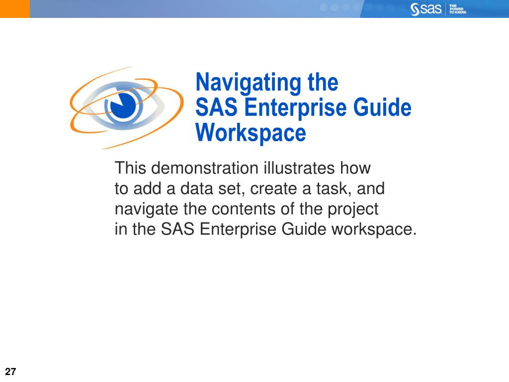 Navigating the SAS Enterprise Guide Workspace This demonstration illustrates how to add a data set, create a task, and navigate the contents of the project in the SAS Enterprise Guide workspace.