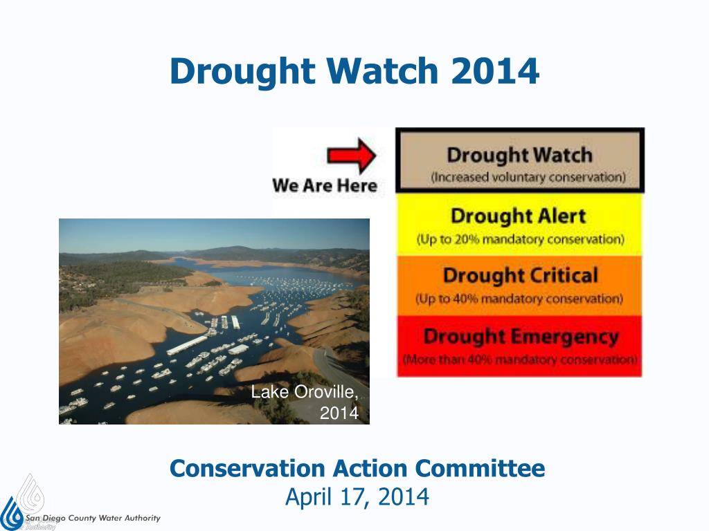 Drought Watch 2014. Lake Oroville, 2014. Conservation Action Committee April 17, 2014. What’s Happened Since We Last Met?. Not Much Good News for California. Jan. 17 – Governor Brown declares state of emergency Jan. 30 – State snowpack level dwindles to 12% of normal