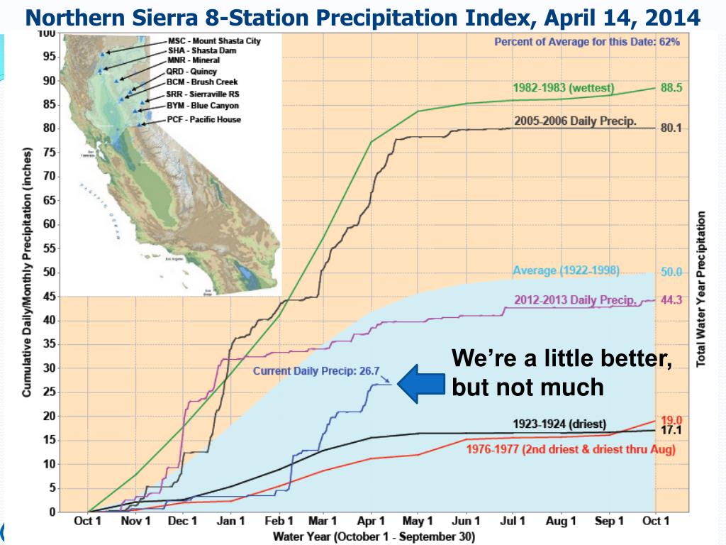 Northern Sierra 8-Station Precipitation Index, April 14, 2014 We’re a little better, but not much