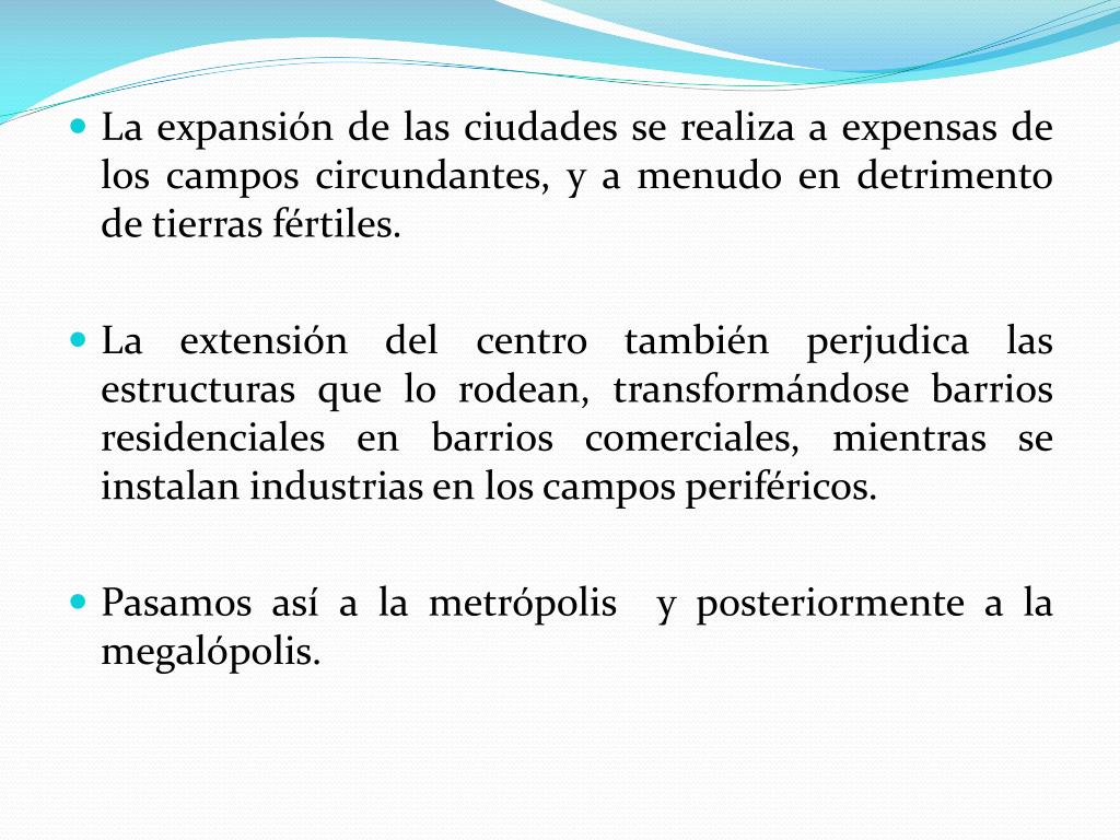 La expansión de las ciudades se realiza a expensas de los campos circundantes, y a menudo en detrimento de tierras fértiles. • La extensión del centro también perjudica las estructuras que lo rodean, transformándose barrios residenciales en barrios comerciales, mientras se instalan industrias en los campos periféricos. • Pasamos así a la metrópolis y posteriormente a la megalópolis.