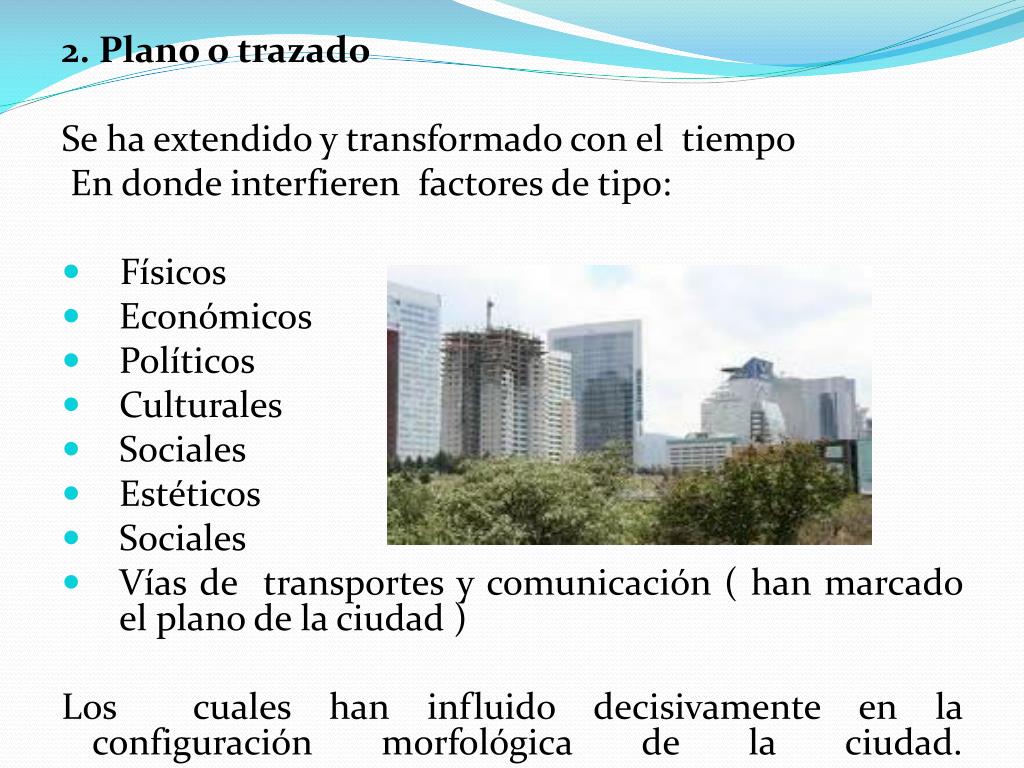2. Plano o trazado Se ha extendido y transformado con el tiempo En donde interfieren factores de tipo: • Físicos • Económicos • Políticos • Culturales • Sociales • Estéticos • Sociales • Vías de transportes y comunicación ( han marcado el plano de la ciudad ) Los cuales han influido decisivamente en la configuración morfológica de la ciudad.