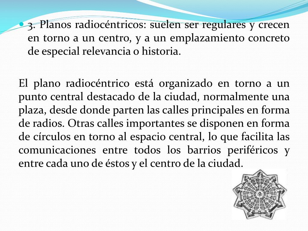 3. Planos radiocéntricos: suelen ser regulares y crecen en torno a un centro, y a un emplazamiento concreto de especial relevancia o historia. El plano radiocéntrico está organizado en torno a un punto central destacado de la ciudad, normalmente una plaza, desde donde parten las calles principales en forma de radios. Otras calles importantes se disponen en forma de círculos en torno al espacio central, lo que facilita las comunicaciones entre todos los barrios periféricos y entre cada uno de éstos y el centro de la ciudad.