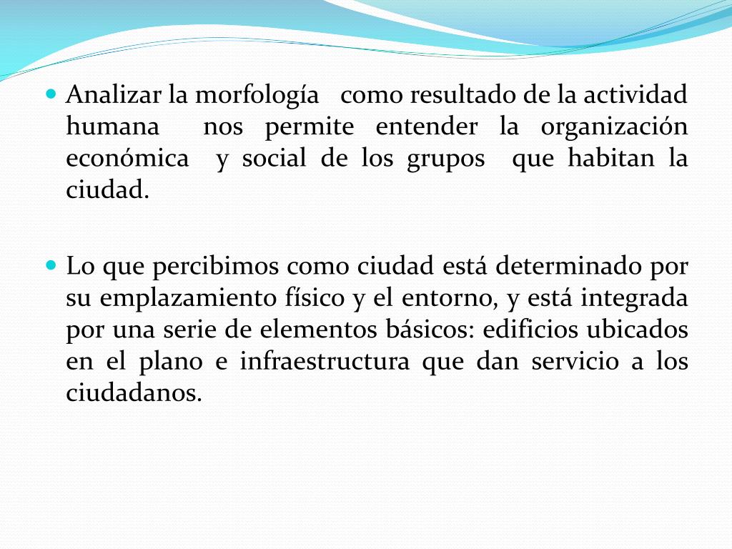 Analizar la morfología como resultado de la actividad humana nos permite entender la organización económica y social de los grupos que habitan la ciudad. • Lo que percibimos como ciudad está determinado por su emplazamiento físico y el entorno, y está integrada por una serie de elementos básicos: edificios ubicados en el plano e infraestructura que dan servicio a los ciudadanos.