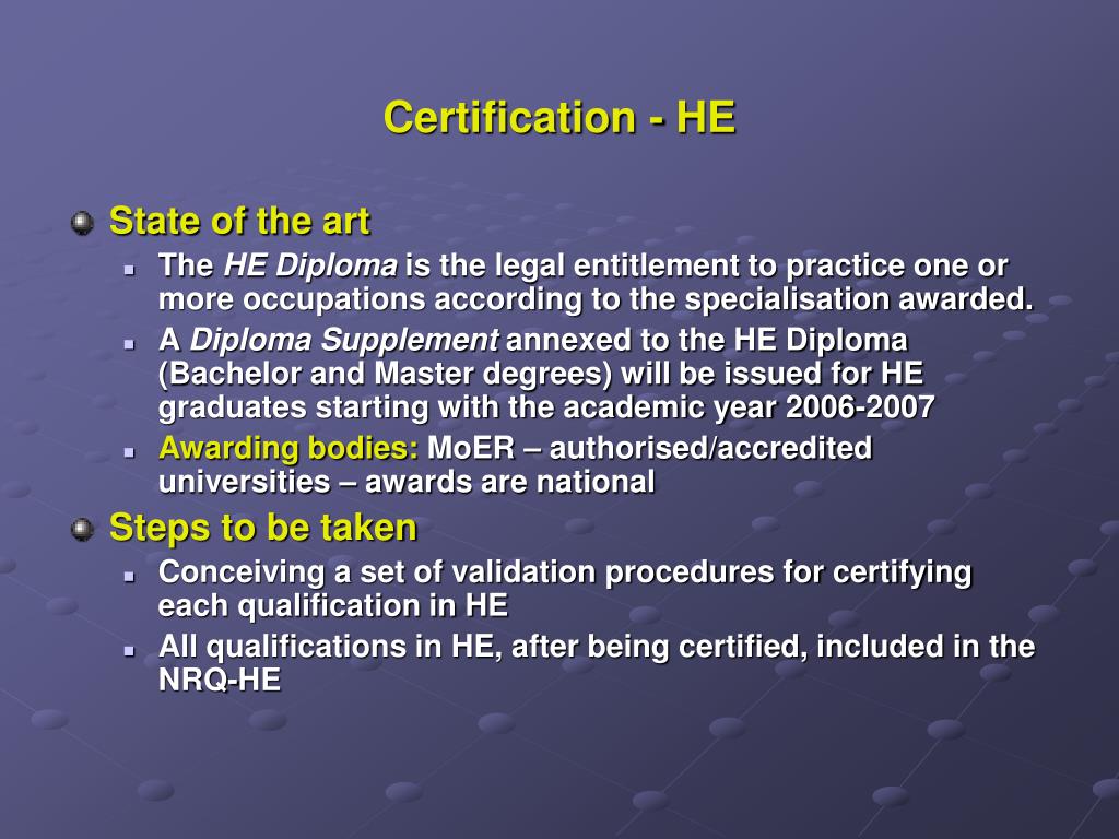 Certification - HE • State of the art • The HE Diploma is the legal entitlement to practice one or more occupations according to the specialisation awarded. • A Diploma Supplement annexed to the HE Diploma (Bachelor and Master degrees) will be issued for HE graduates starting with the academic year 2006-2007 • Awarding bodies: MoER – authorised/accredited universities – awards are national • Steps to be taken • Conceiving a set of validation procedures for certifying each qualification in HE • All qualifications in HE, after being certified, included in the NRQ-HE