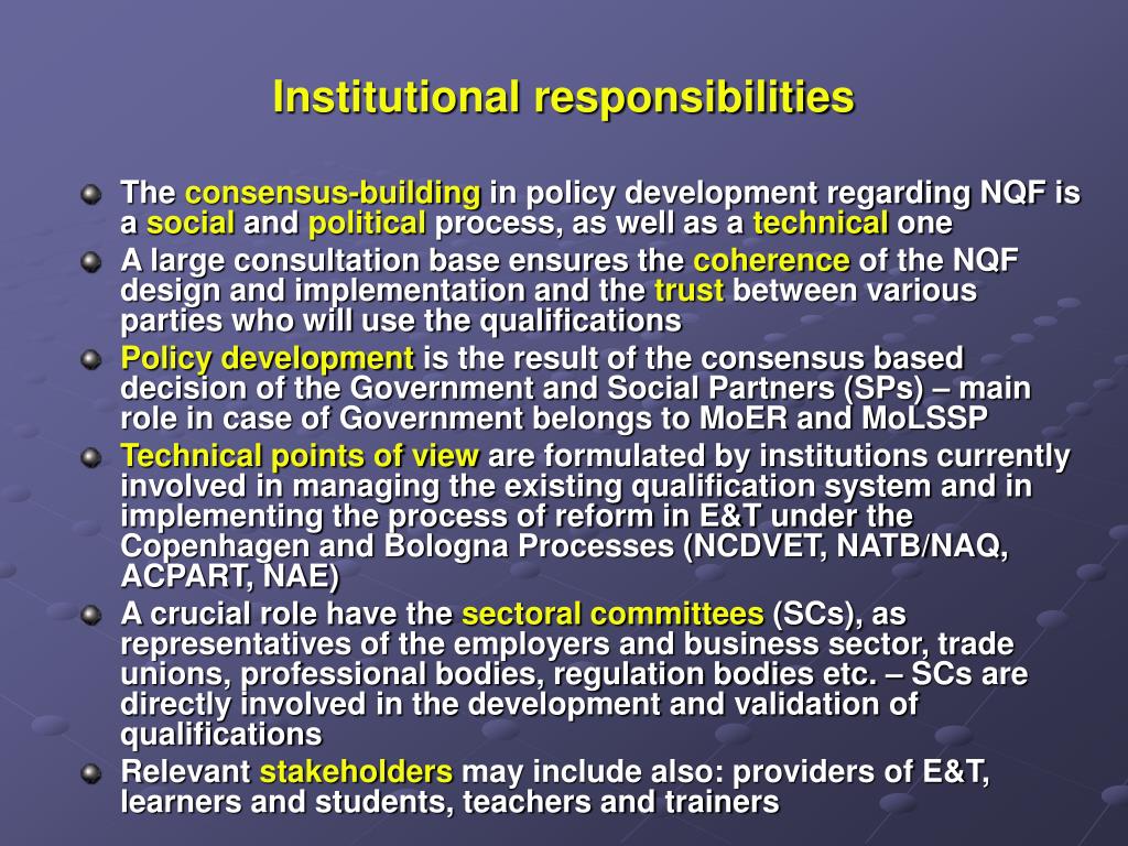 Institutional responsibilities • The consensus-building in policy development regarding NQF is a social and political process, as well as a technical one • A large consultation base ensures the coherence of the NQF design and implementation and the trust between various parties who will use the qualifications • Policy development is the result of the consensus based decision of the Government and Social Partners (SPs) – main role in case of Government belongs to MoER and MoLSSP • Technical points of view are formulated by institutions currently involved in managing the existing qualification system and in implementing the process of reform in E&T under the Copenhagen and Bologna Processes (NCDVET, NATB/NAQ, ACPART, NAE) • A crucial role have the sectoral committees (SCs), as representatives of the employers and business sector, trade unions, professional bodies, regulation bodies etc. – SCs are directly involved in the development and validation of qualifications • Relevant stakeholders may include also: providers of E&T, learners and students, teachers and trainers