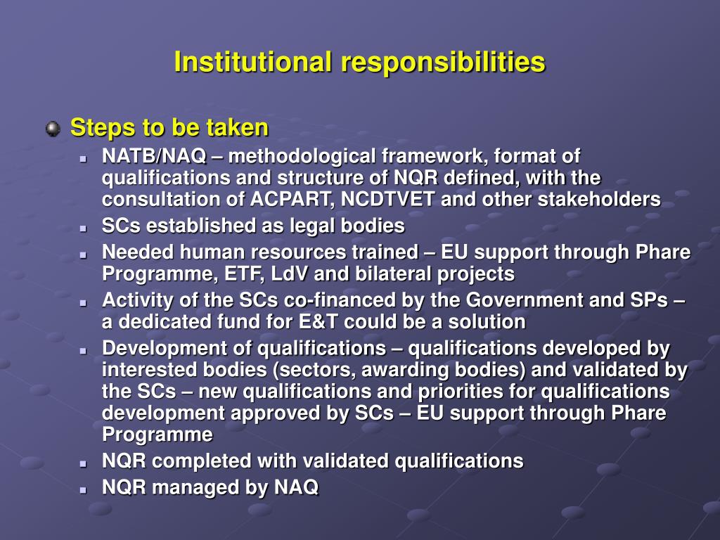 Institutional responsibilities • Steps to be taken • NATB/NAQ – methodological framework, format of qualifications and structure of NQR defined, with the consultation of ACPART, NCDTVET and other stakeholders • SCs established as legal bodies • Needed human resources trained – EU support through Phare Programme, ETF, LdV and bilateral projects • Activity of the SCs co-financed by the Government and SPs – a dedicated fund for E&T could be a solution • Development of qualifications – qualifications developed by interested bodies (sectors, awarding bodies) and validated by the SCs – new qualifications and priorities for qualifications development approved by SCs – EU support through Phare Programme • NQR completed with validated qualifications • NQR managed by NAQ